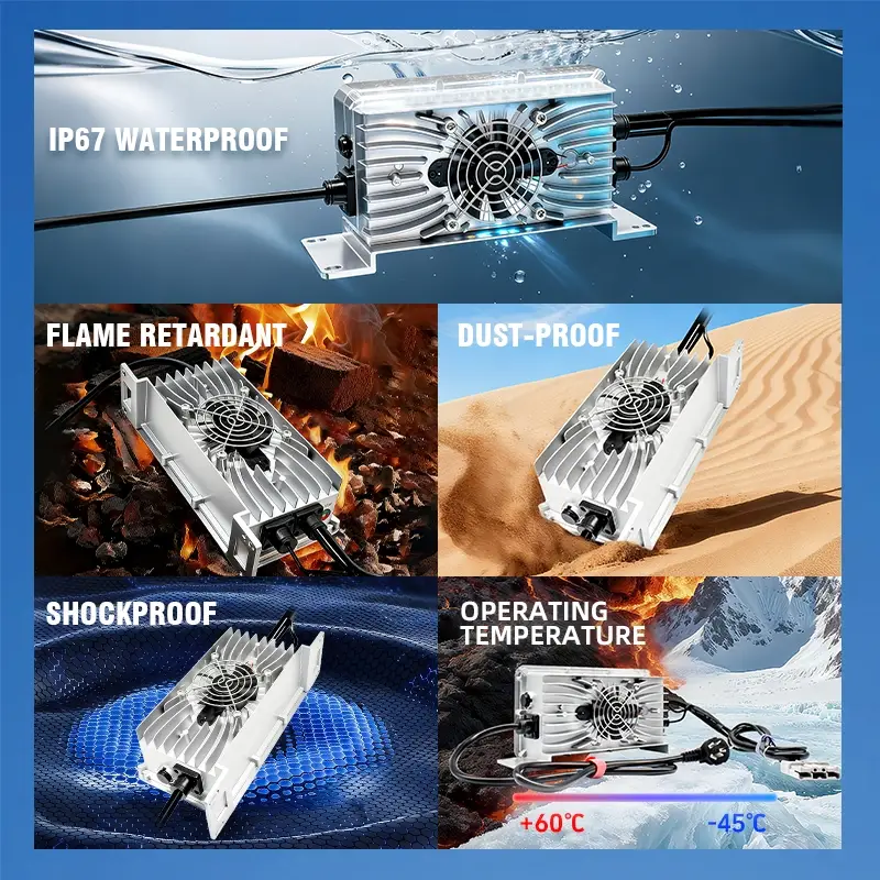 Den fulde aluminiumslegeringsskal forbedrer varmeafledningseffektiviteten med 35 % sammenlignet med plastskaller, og holder opladerens driftstemperatur under 60 ℃ under kontinuerlig 1,2 kW drift, hvilket beskytter interne komponenter og forlænger levetiden. Derudover er den udstyret med flerlags sikkerhedsbeskyttelsesmekanismer, herunder overspændingsbeskyttelse (55V max), overstrømsbeskyttelse (28A max), kortslutningsbeskyttelse og overtemperaturbeskyttelse, der effektivt forhindrer skader på opladeren og batteriet og sikrer sikker drift i alle ombordmiljøer.