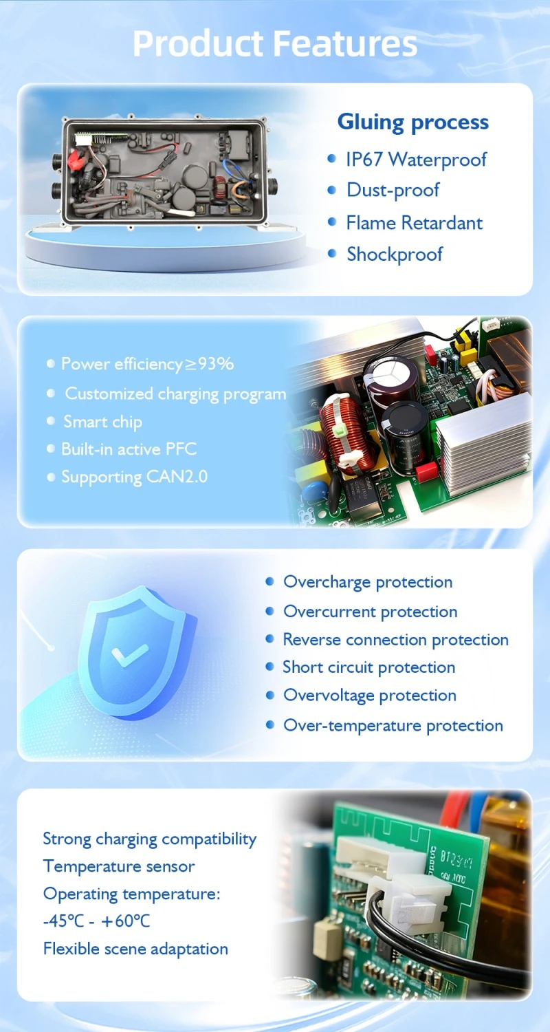 Med en nominel effekt på 1,2 kW og en udgangsstrøm på 25 A kan denne 1,2 kW indbyggede batterioplader fuldt oplade et 48V 100Ah batteri på kun 4 timer, hvilket er 20 % hurtigere end almindelige 1000W opladere. Det højeffektive kredsløbsdesign reducerer energitabet til mindre end 10 %, hvilket sparer energi, samtidig med at det sikrer hurtig opladning, hvilket gør det ideelt til scenarier, der kræver hurtig genopfyldning af batteri.