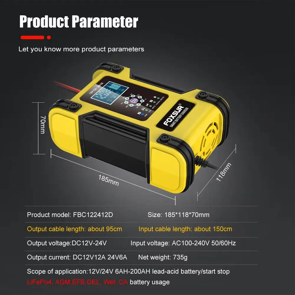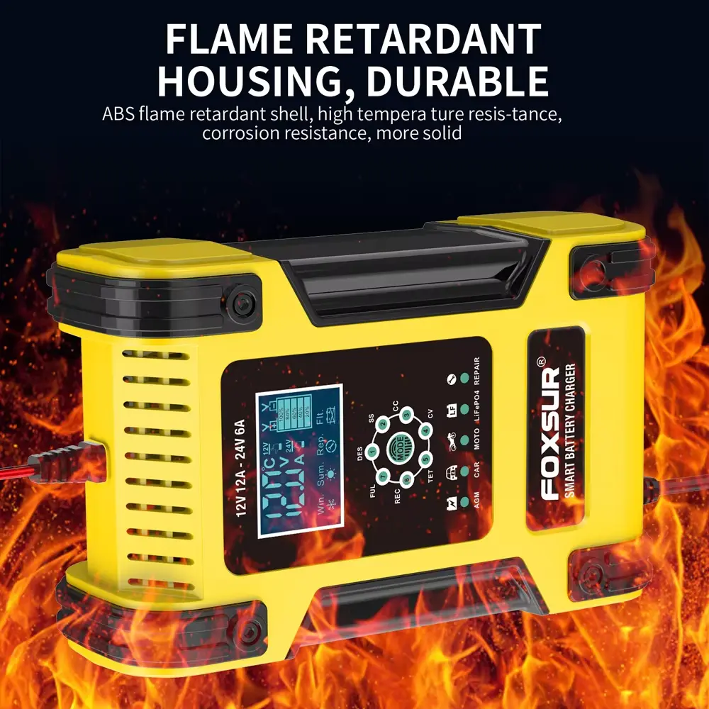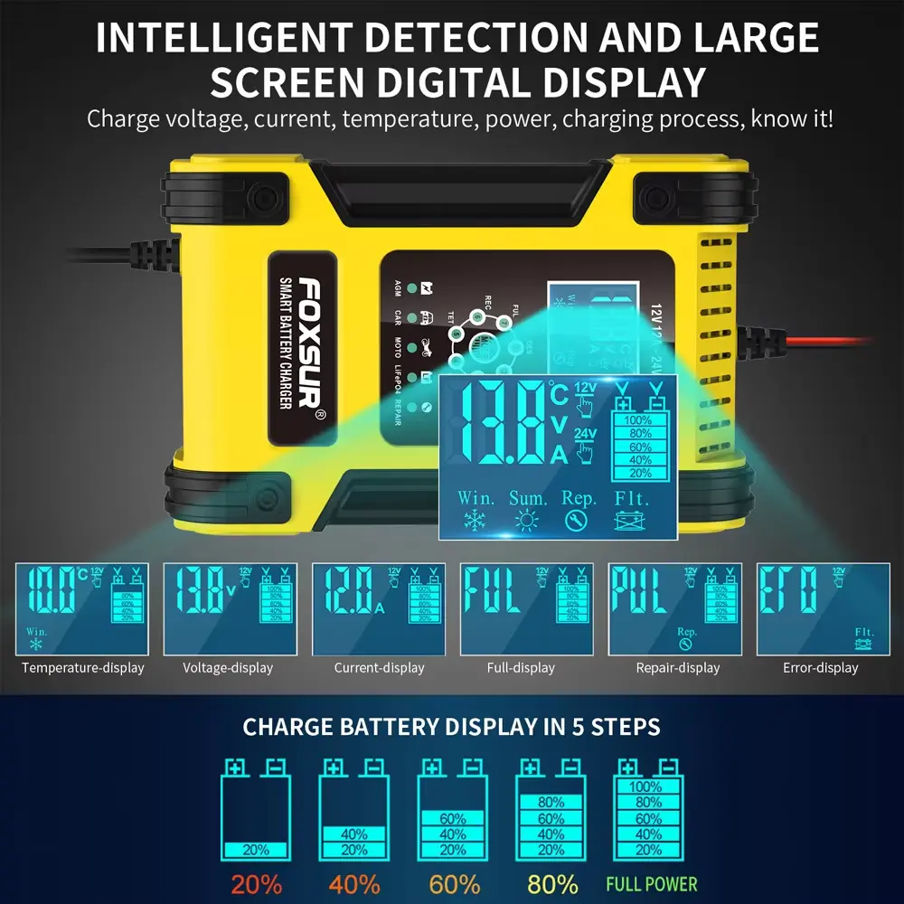 I modsætning til andre opladere på markedet tilbyder 12V 24V 12A 7-segments intelligent bly-syre batterioplader omfattende sikkerhedsfunktioner til at beskytte både dit batteri og selve opladeren.