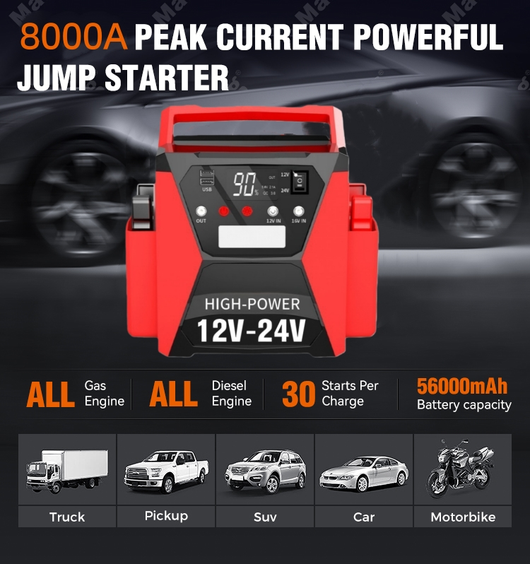 STARWELL introducerer sin højtydende 12V/24V Car Jump Starter Intelligent Battery Charger, en game-changer for køretøjsejere, der søger pålidelighed og intelligens i batterivedligeholdelse og nødstart. Udstyret med en 8000A spidsstrøm og 4000A startstrøm kombinerer denne dobbeltspændings intelligente batterioplader robust kraft med smart teknologi, hvilket gør den velegnet til alle gasmotorer og dieselmotorer op til 15L, og dækker biler, lastbiler, autocampere, motorcykler, både og endda tunge erhvervskøretøjer.