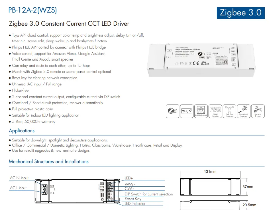 Designet til max.12W LED-belastninger, Zigbee 3.0 LED Driver giver komplette sikkerhedsbeskyttelsesfunktioner. Stabilt output og pålidelig trådløs kommunikation gør den ideel til forskellige indendørs smarte belysningsprojekter med langsigtet stabilitet.