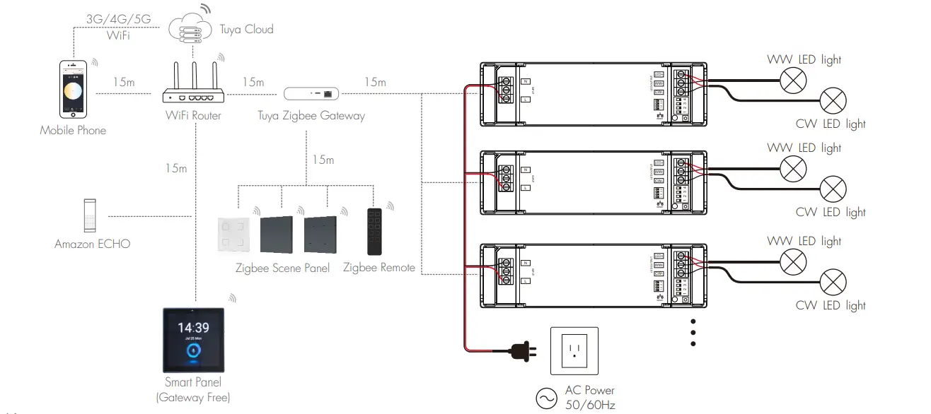 TUYA Zigbee LED-driveren understøtter fuldt ud TUYA Zigbee-protokollen til stabil trådløs forbindelse, der opnår jævn flimmerfri CCT og lysstyrkedæmpning. Den understøtter APP-kontrol, stemmestyring, gruppekontrol og scenetilstand, hvilket giver smarte lyssystemer stor bekvemmelighed.