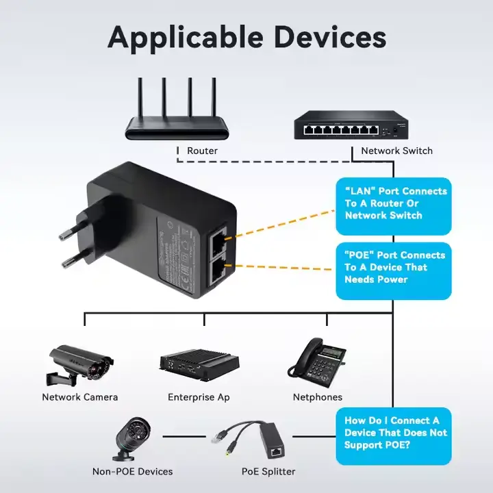 12W POE Adapter Udskiftelige Plug POE Injector er meget udbredt i forskellige netværks- og sikkerhedsmiljøer: