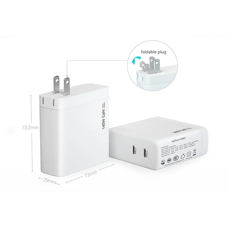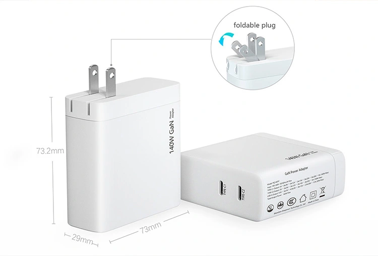 140W dual usb c-port PD Charger US-stik foldbar: Enkeltporten kan levere op til 140W strøm. Udgangseffekten med to porte tildeles intelligent samtidigt. Når du oplader en bærbar computer og en mobiltelefon på samme tid, forbliver effektiviteten uændret.