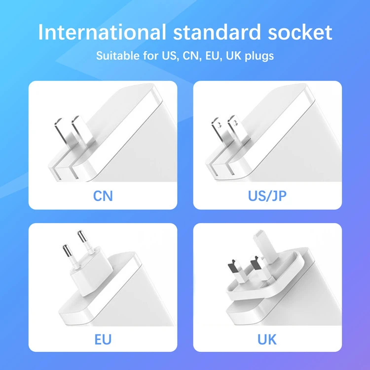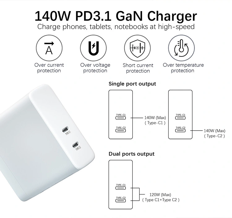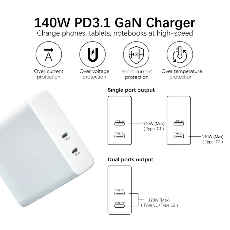 GAN: Med GaN-chips reduceres størrelsen af 140W PD Charger med 50 % sammenlignet med traditionelle opladere, hvilket gør den nem at have med på forretningsrejser eller kontorbrug uden at optage plads i stikkontakten.