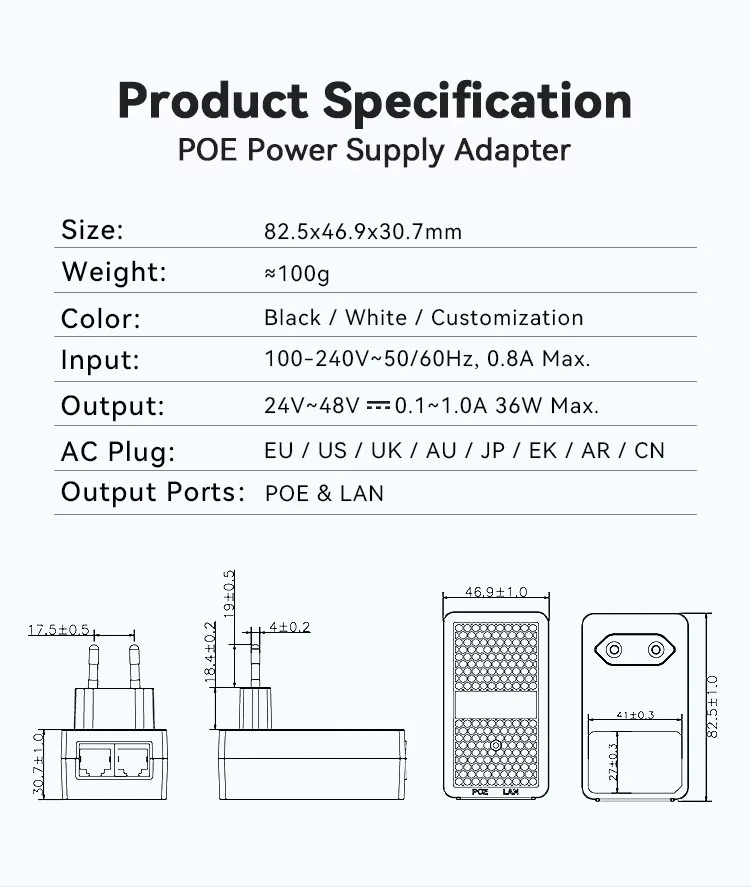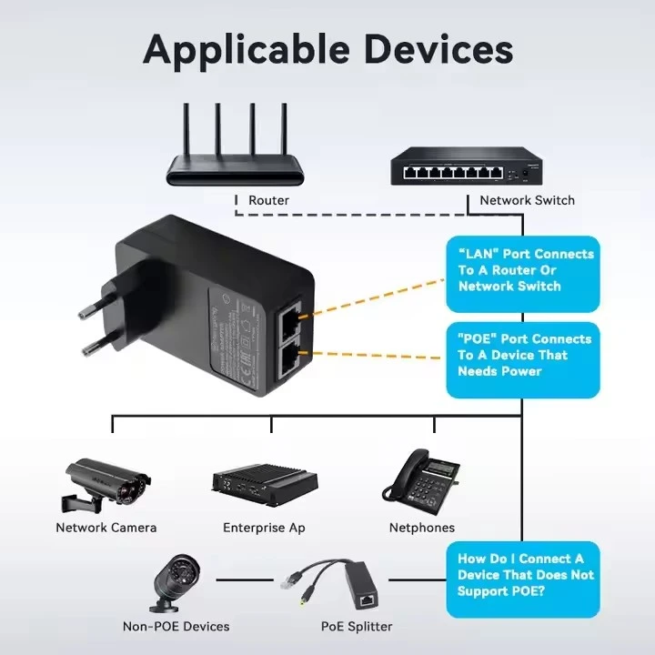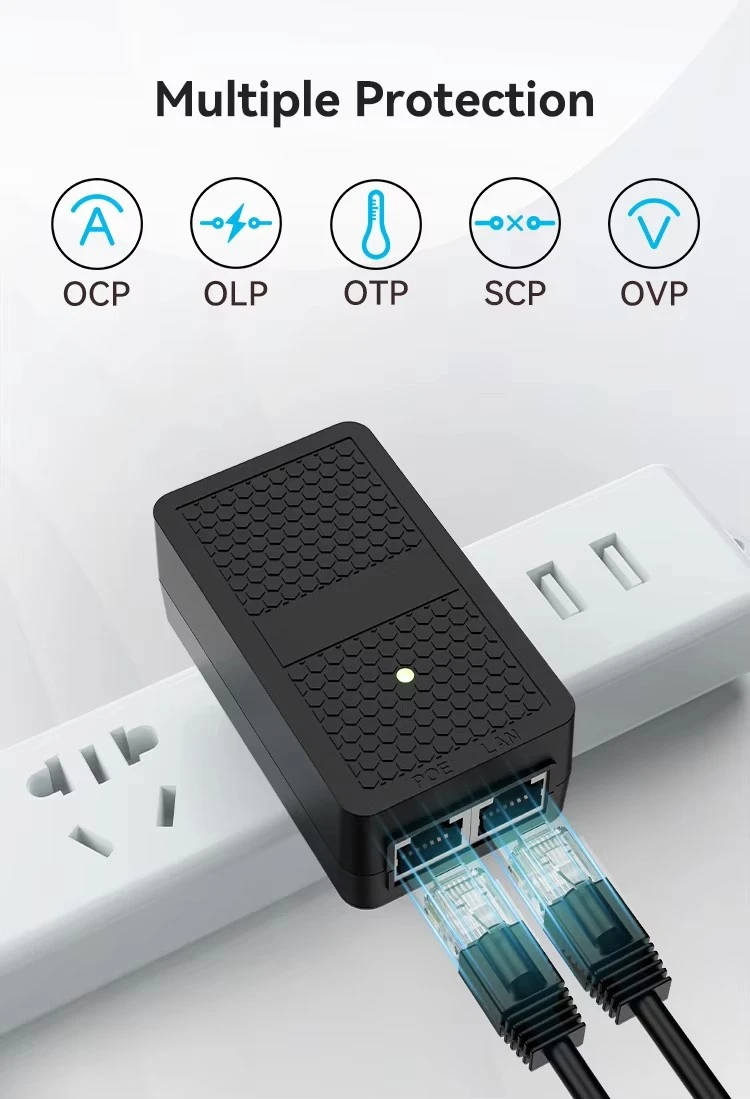 STARWELL fabrikkens 24V 1A vægmonterede EU-stik POE-injektor har universel AC-indgang (100-240V) med valgbare udgange: 24V/0,5A, 24V/1A eller 48V/0,5A. Den understøtter både passive og aktive PoE-protokoller med fleksible pin-tildelinger, herunder Midspan (4,5+/7,8-) og Endspan (1,2+/3,6-). Fuldt i overensstemmelse med IEEE802.3af/at/bt PoE++-standarder, den leverer exceptionelle datahastighedsegenskaber fra 10/100/1000M til 2,5G/5G/10G bps.