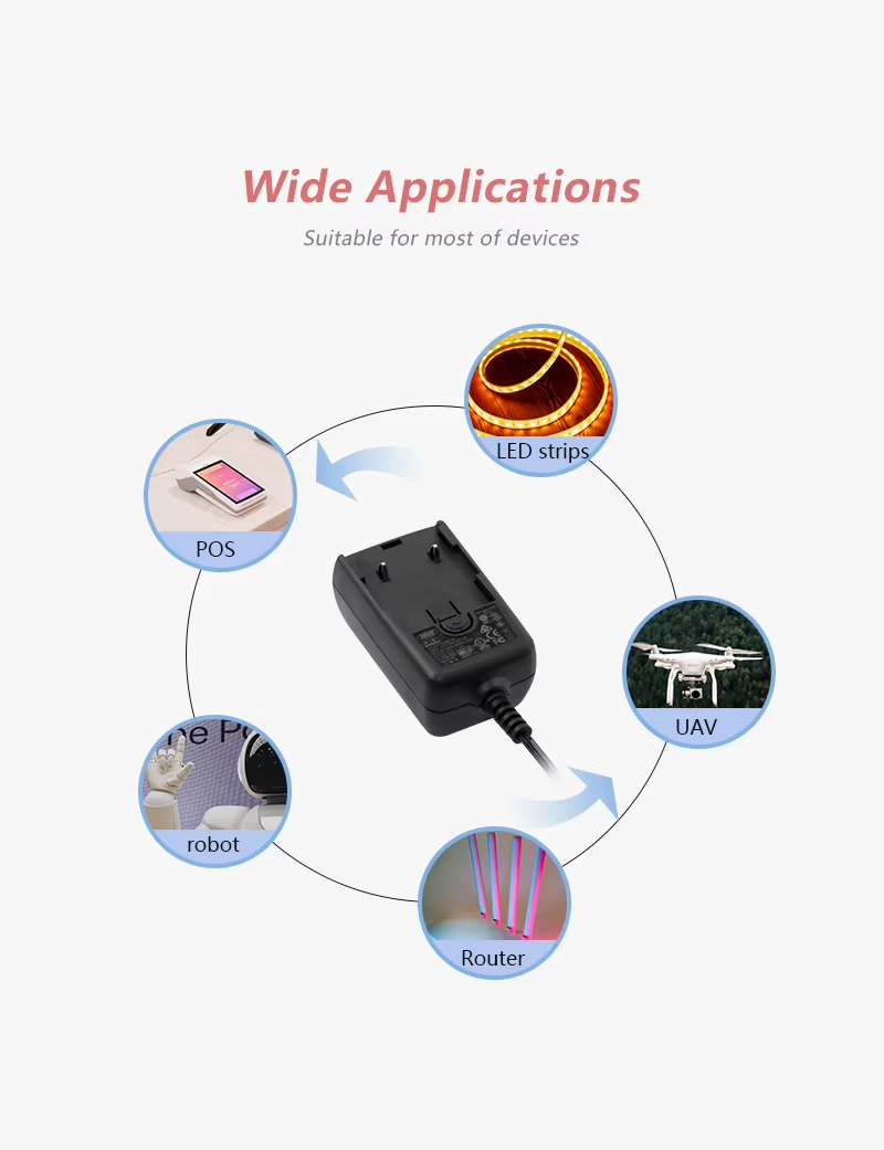 Bredt udvalg af anvendelsesscenarier: Uanset om det er til strømforsyning af LED-lysstrimler, smarthøjttalere, netværksroutere eller andre små elektriske apparater, er denne kraftfulde Switching-udskiftelige strømforsyning dit mest ideelle og betryggende valg!