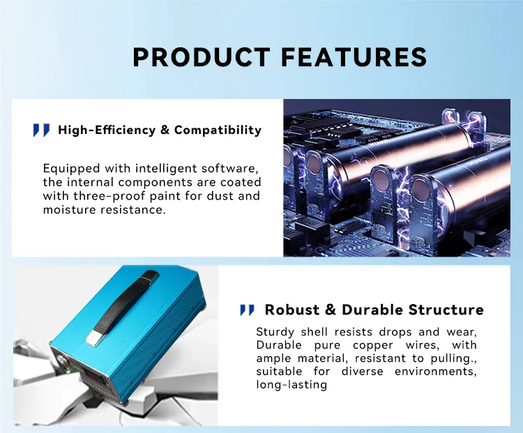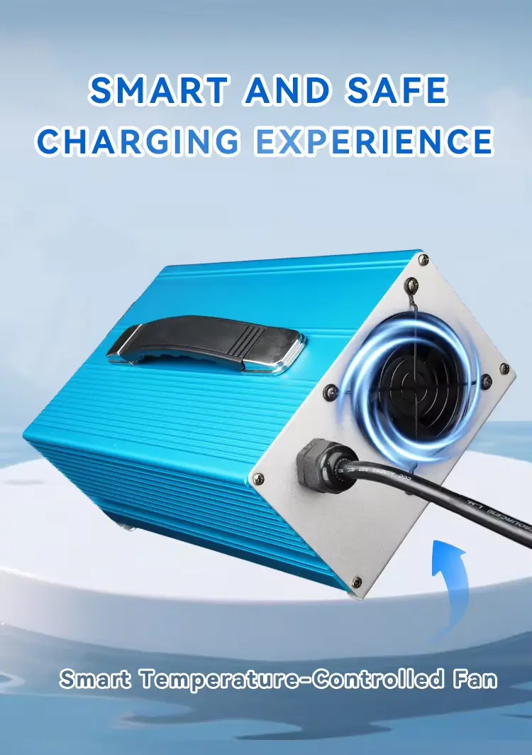 Den bruger en intelligent fire-trins opladningslogik: foropladning, konstant strøm, konstant spænding og flydende opladning, som effektivt forlænger batteriets levetid og samtidig sikre fuld opladning. Indbyggede fuld beskyttelsesmekanismer omfatter overspænding, overstrøm, overtemperatur, kortslutning og omvendt polaritetsbeskyttelse, hvilket øger driftssikkerheden og pålideligheden. Opladeren understøtter automatisk slukning ved fuld opladning, hvilket frigør brugere fra manuel overvågning.
