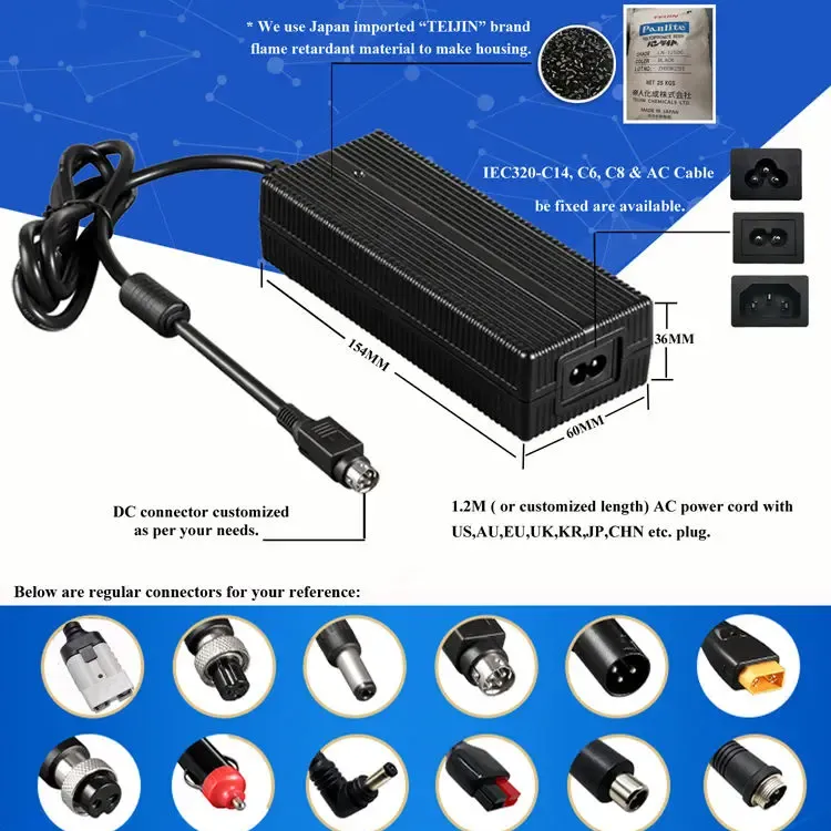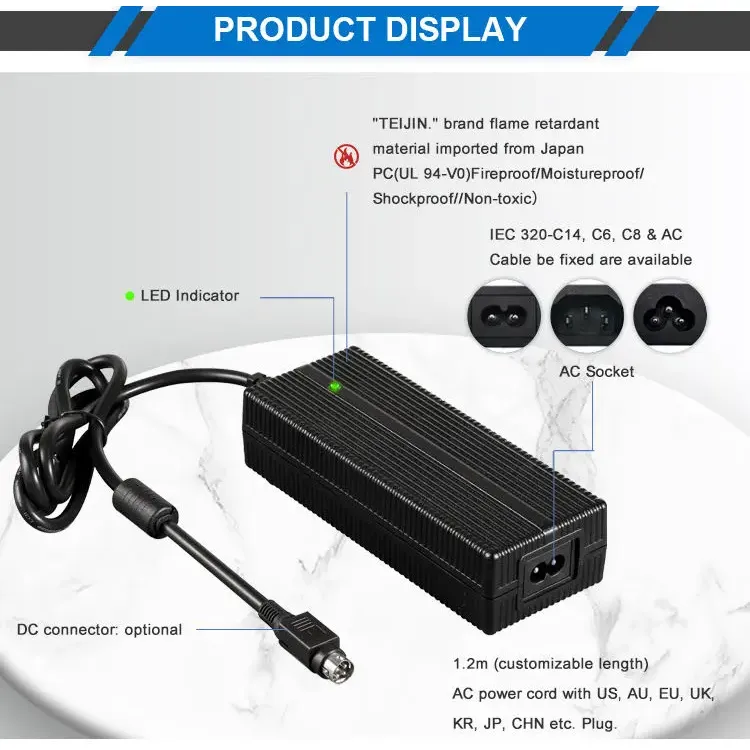 Global kompatibilitet og fleksibelt design: Denne oplader er bygget med et universelt AC-indgangsområde på 100–240VAC, 50/60Hz og understøtter brug over hele verden. Den tilbyder flere muligheder for vekselstrømsindgang (IEC320-C14, C6, C8) og leveres med en 1,2 M strømledning, der kan tilpasses med US, AU, EU, UK, KR, JP, CHN og andre regionale stik. Huset er konstrueret af pc-brandsikkert materiale, hvilket sikrer holdbarhed og sikkerhed under forskellige driftsforhold.