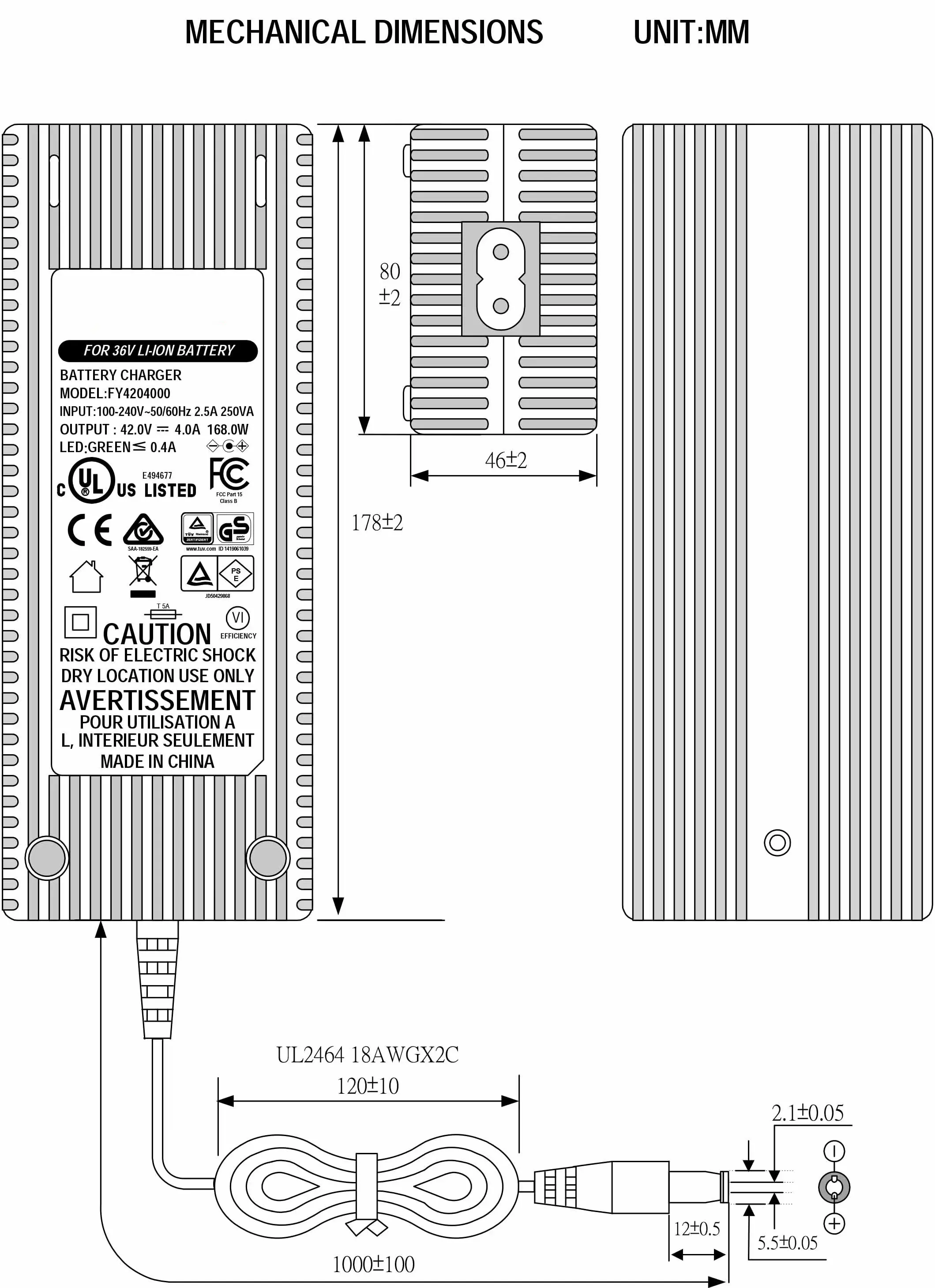 Omfattende beskyttelse og certificeringer: Sikkerheden er i højsædet. 42V 4A scooterbatteriopladeren har robuste beskyttelsesmekanismer, herunder kortslutnings-, overspændings-, overtemperatur- og overbelastningsbeskyttelse, med HIPOT-test op til 4200V for øget isoleringssikkerhed. Den fungerer effektivt med >89 % effektivitet og har en omfattende liste over globale certificeringer: UL, CUL, GS, CE, BS, SAA, KC, PSE, CB, FCC, EMC, ROHS og REACH, der overholder sikkerhedsstandarder såsom UL60950, IEC609035 og IEC65.