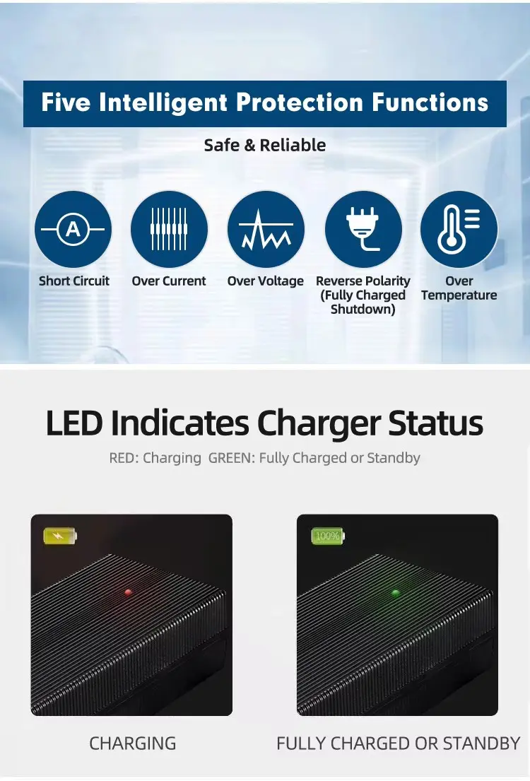 Udstyret med intelligent tre-trins opladning (CC/CV/Trickle), sikrer den optimal batterisundhed ved at forhindre overopladning, overophedning og kortslutninger. Det holdbare hus af aluminiumslegering giver fremragende varmeafledning til sikker, langvarig brug. Med et standard 3-benet XLR-stik tilbyder denne oplader pålidelig, effektiv strømforsyning, hvilket gør den til en ideel erstatning eller opgradering til dine elektriske mobilitetsenheder.
