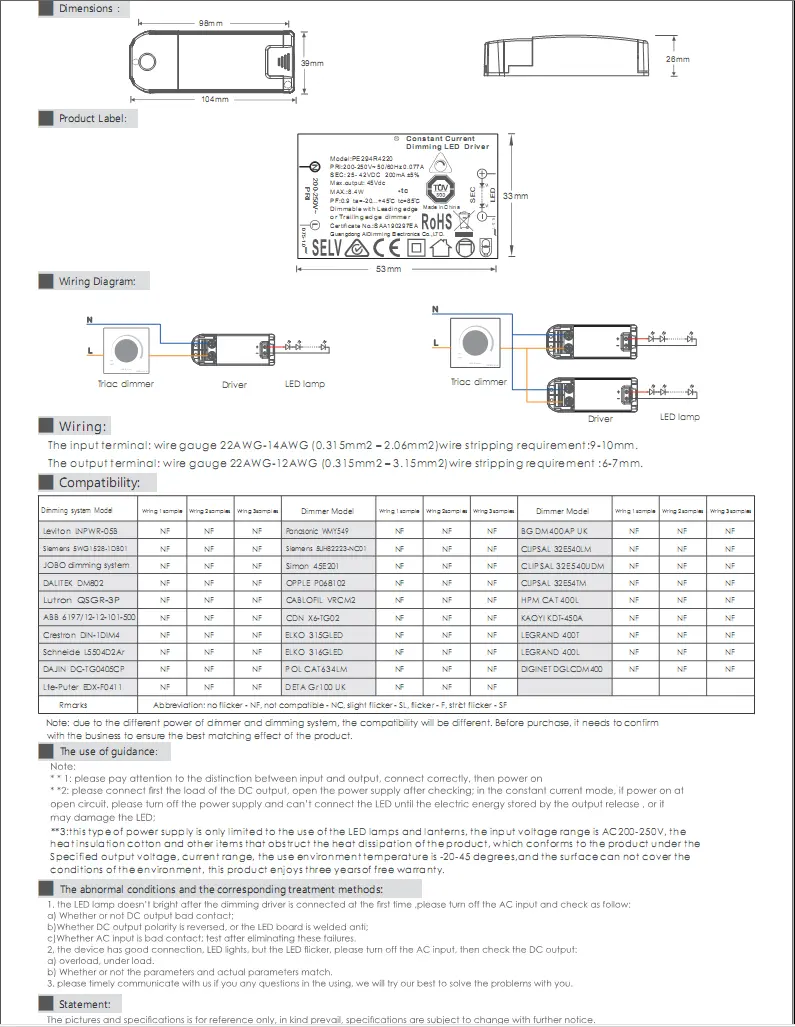 Højkvalitets PE294R 42V max 200ma konstant strøm triac-dæmpende LED-driver er en af de konstantstrømdæmpende LED-dykkere udviklet af den kinesiske producent Starwell med høj effektfaktor, høj effektivitet, høj præcision, brugen af den effektive stabile, stabile switch-kontrolchip med lavt tab og de højtydende komponenter giver den lavstøj lang levetid og andre egenskaber.
