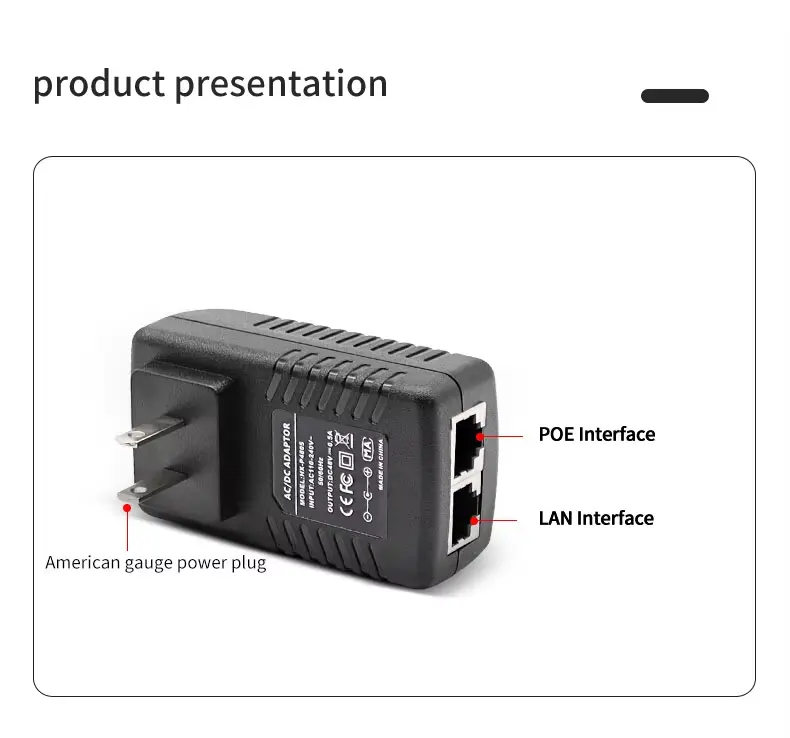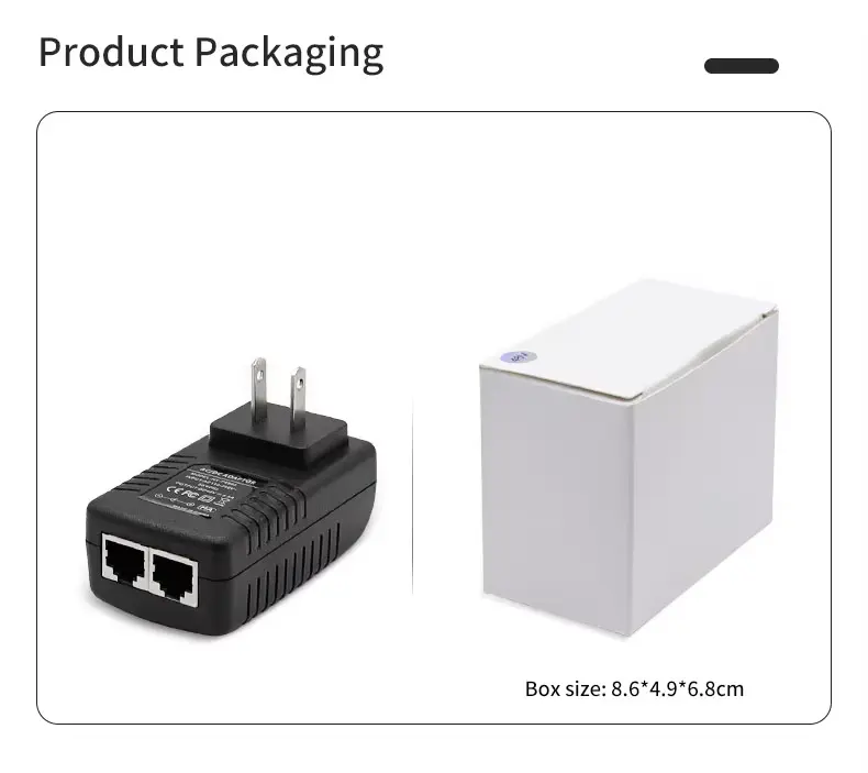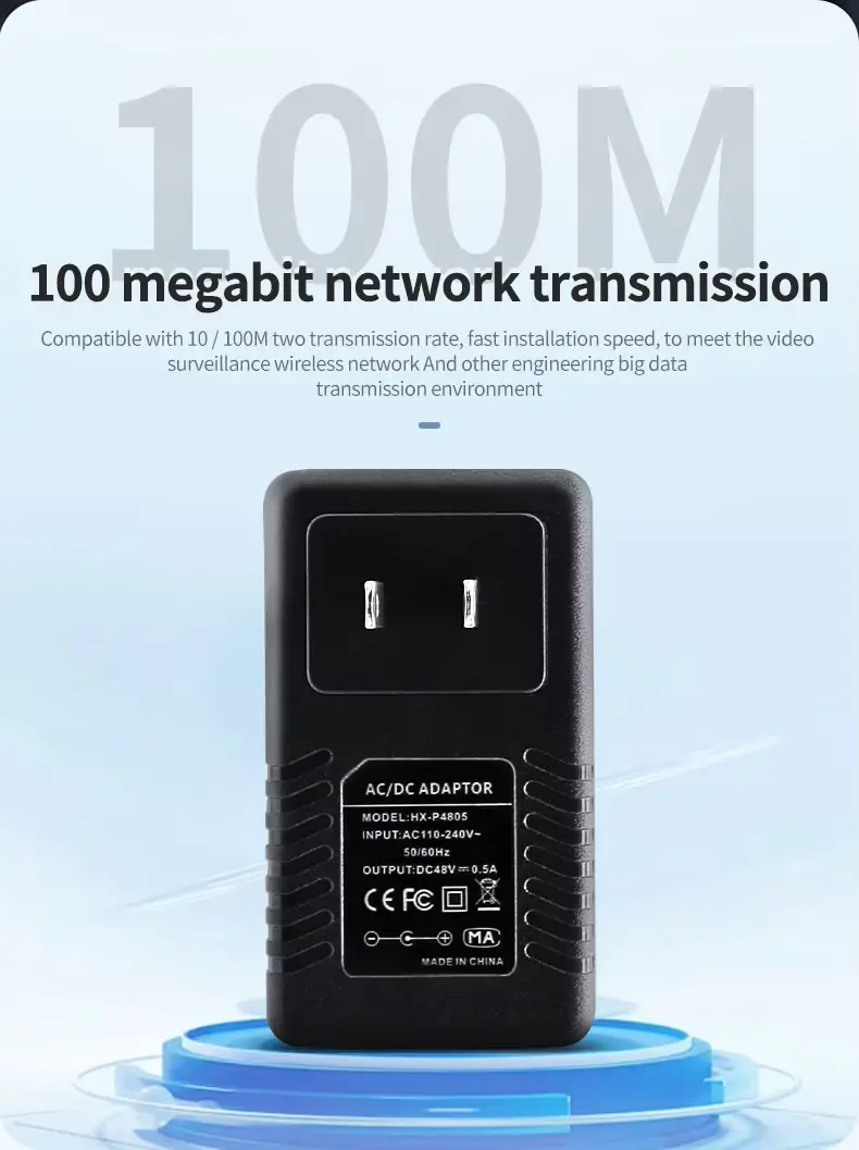 En højkvalitets 48V 0,5A Wall Plug PoE Injector Ethernet Adapter tilbydes af den kinesiske producent Starwell. Denne strømforsyningsenhed leverer en udgangseffekt på 24W (48V/0,5A), hvilket gør den særligt velegnet til udendørs trådløse enheder – såsom dem fra mærker som Ubiquiti og MikroTik – samt langrækkende IP-kameraer og netværksbroer. Produktet har flere beskyttelsesmekanismer mod overspænding, overstrøm og kortslutninger; den fungerer inden for et temperaturområde på -10°C til 60°C og leveres med 5 års garanti.