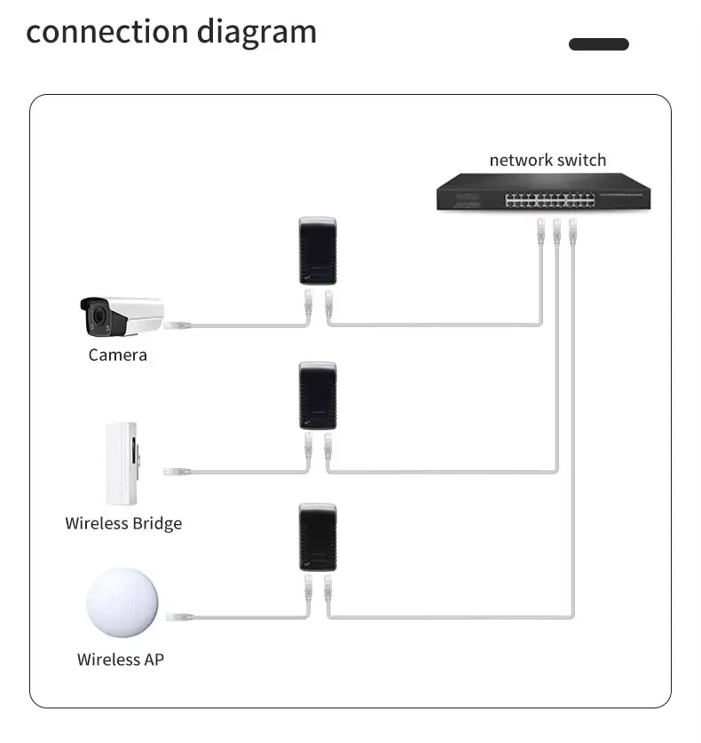 Denne injektor er specielt designet til netværksenheder, der kræver en 48V DC-indgang via Ethernet. Det er bredt kompatibelt med industristandardudstyr, herunder: