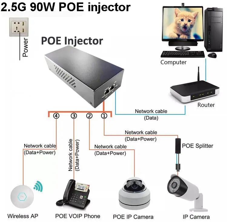 Starwell-fabrikkens 48V 90W PoE-injektor PoE-adapter, en højtydende løsning designet til pålidelig strøm- og datalevering over Ethernet. Fuldt i overensstemmelse med IEEE802.3af/at/bt PoE++-standarder, sikrer denne injektor stabil 2,5G højhastighedsdatatransmission og kan drive højkrævede enheder som IP-kameraer, trådløse AP'er, netværksswitches og IP-terminaler. Dets kompakte, plug-and-play-design forenkler installationen i hjemmet, kontoret og industrielle netværk og tilbyder sikker og effektiv PoE-strømforsyning med minimal opsætning.