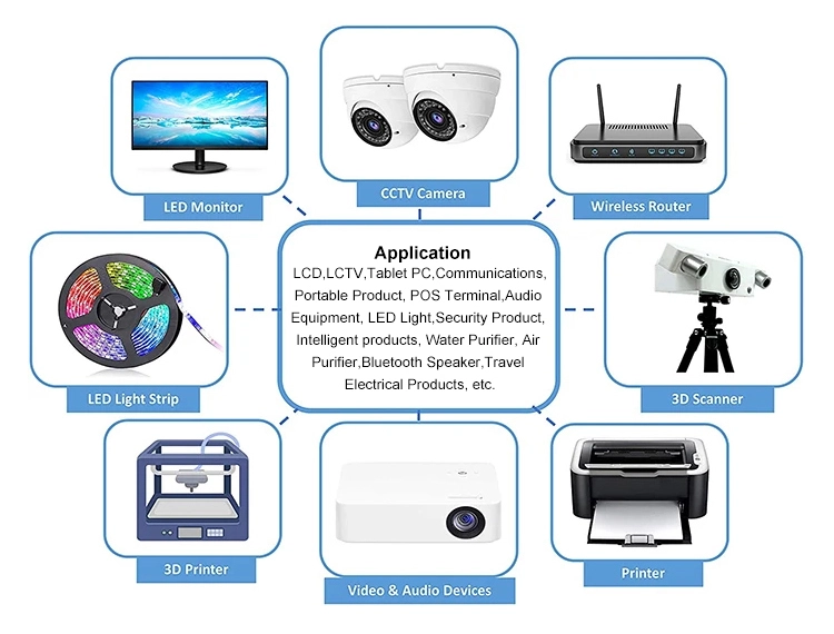 * Flere enheder til 48W-serien: 5V/9V/12V/15V/19V/24V/36V/48V tilgængelig * Sikkerhed: OCP/OVP/OTP, SCP, automatisk overbelastningsafbrydelse, overspændingsafbrydelse, automatisk termisk afbrydelse. * Bred kompatibilitet: LED Strip-lys, 3D-printer, radiotransceiver, CCTV-kameraer, subwooferforstærker til bil, lydforstærker, trådløs router, ADSL Cats, luftfugter, HUB, tastatur, BT-højttaler, skærm, webkamera, DVR, NVR, lyd-/videostrømforsyning