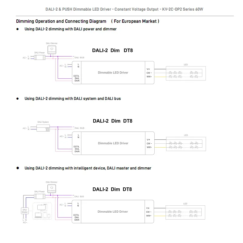 Ved at anvende DALI digital dæmpning understøtter den 0,1 %-100 % jævn flimmerfri dæmpning og præcis CCT-justering fra 2700K til 6500K, hvilket holder lysstyrken ensartet under farvetemperaturskift. Indbygget aktiv PFC øger effektiviteten med op til 88 % med lavt strømforbrug uden belastning. Den har blød start, overspænding, overstrøm og kortslutningsbeskyttelse, hvilket sikrer sikker drift.