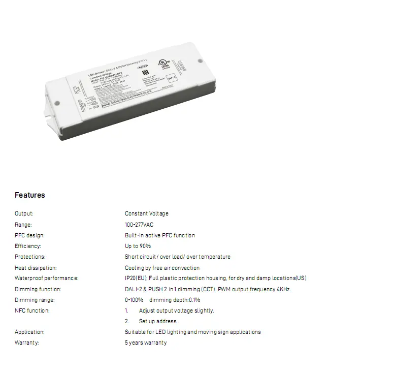 Den er anbragt i et kompakt, flammehæmmende kabinet og passer til indendørs kommerciel belysning såsom kontorer, hoteller og indkøbscentre. Med pålidelig ydeevne og nem DALI-busintegration muliggør den intelligent lysstyring og scenestyring, ideel til højkvalitets justerbare hvide belysningsprojekter.