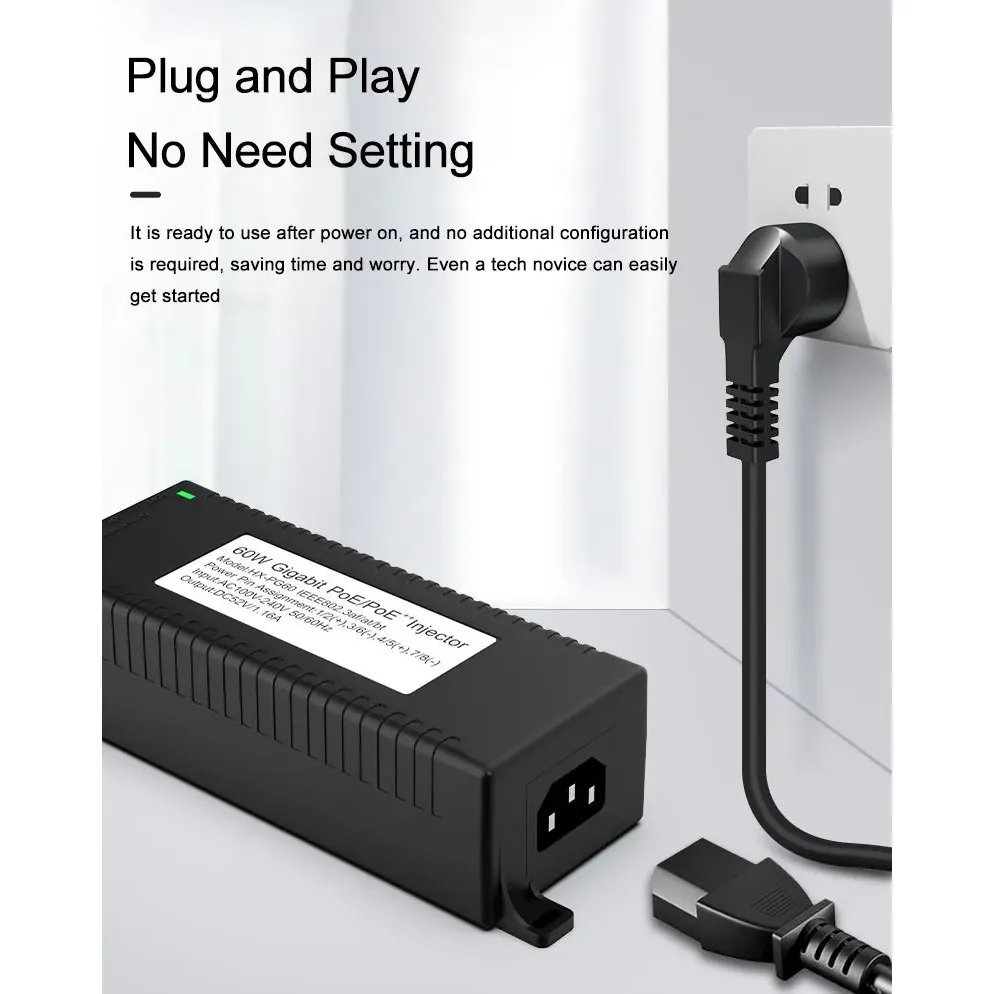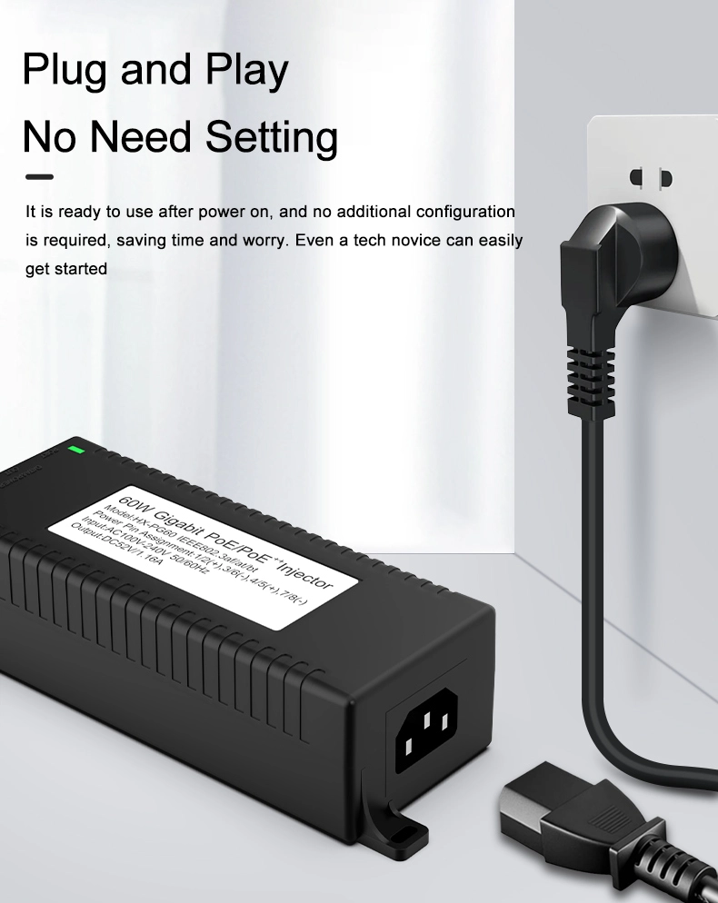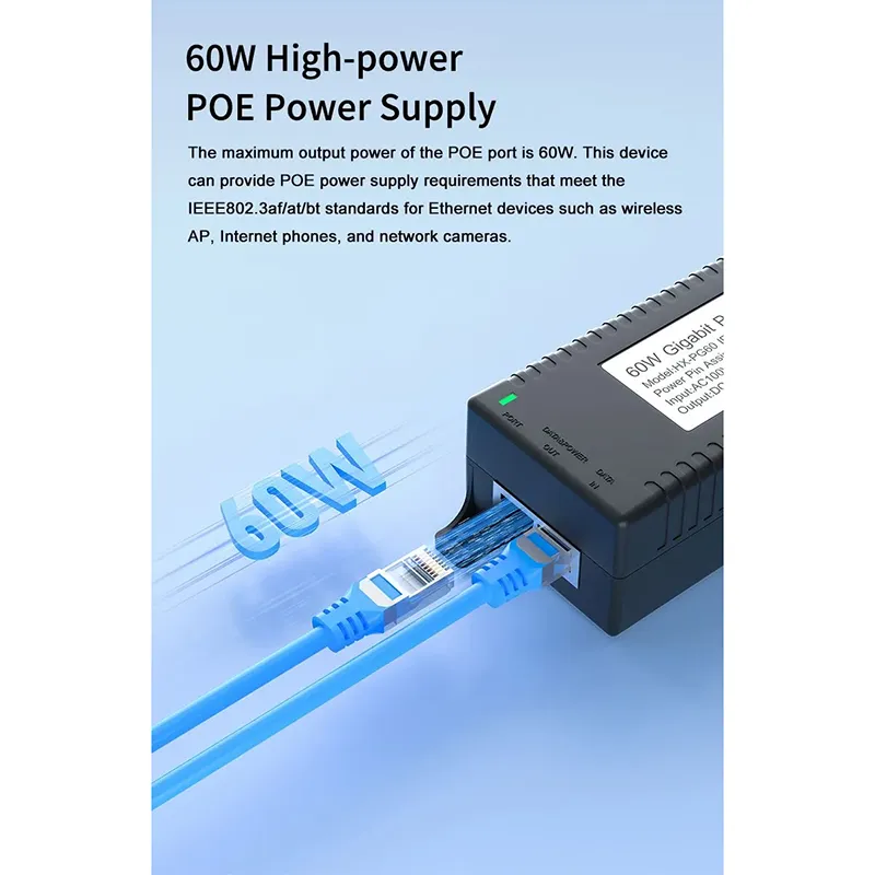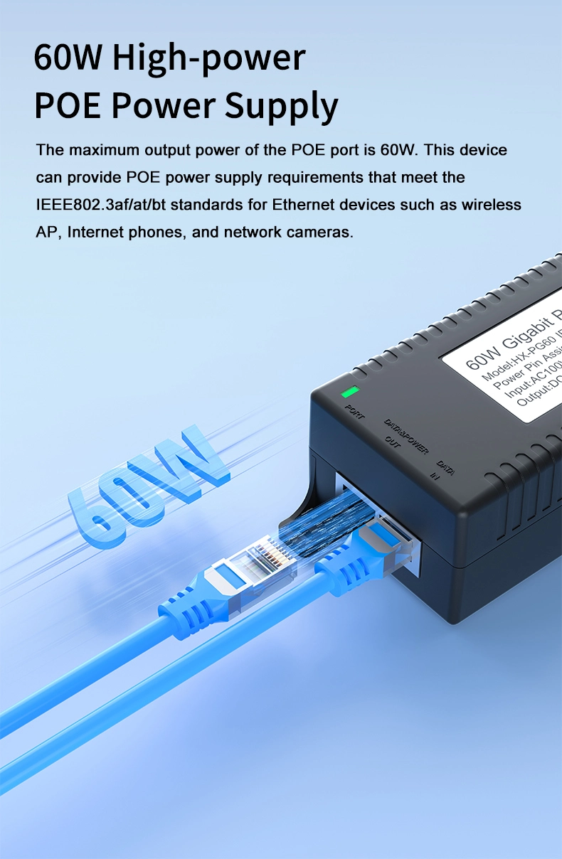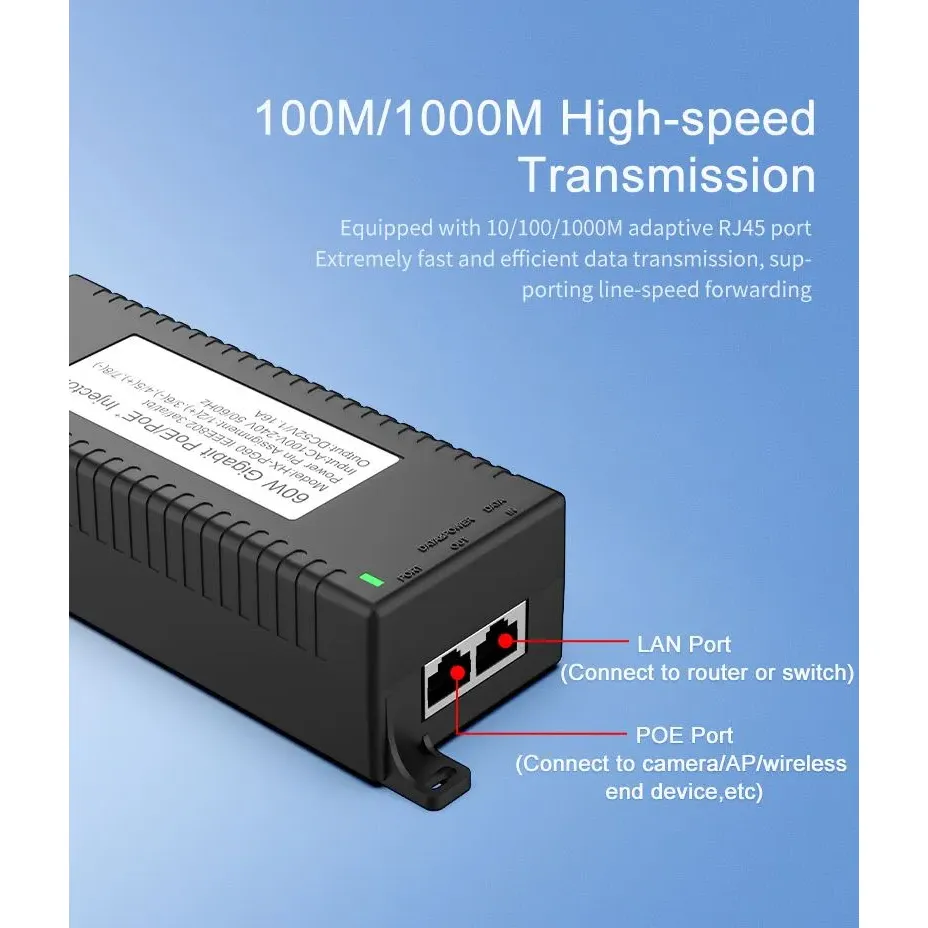 Sikkerhedsovervågning: Gigabit 60 W desktop POE-injektor til IP-kamerasikkerhed og netværksenhed giver stabil strøm til IP-kameraer og PTZ-kameraer.