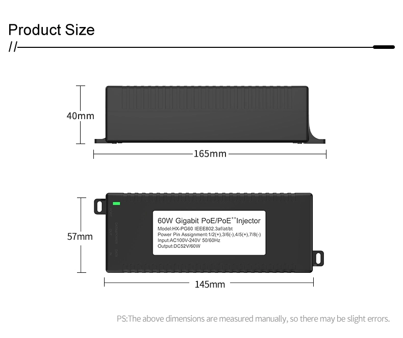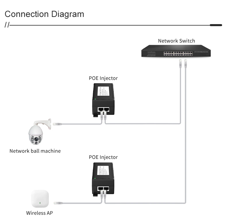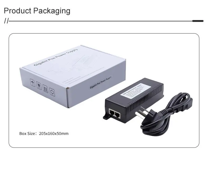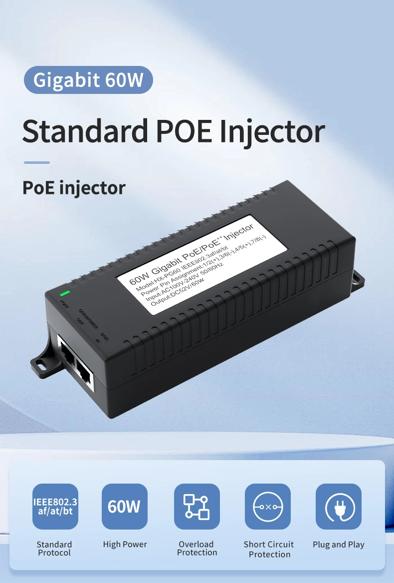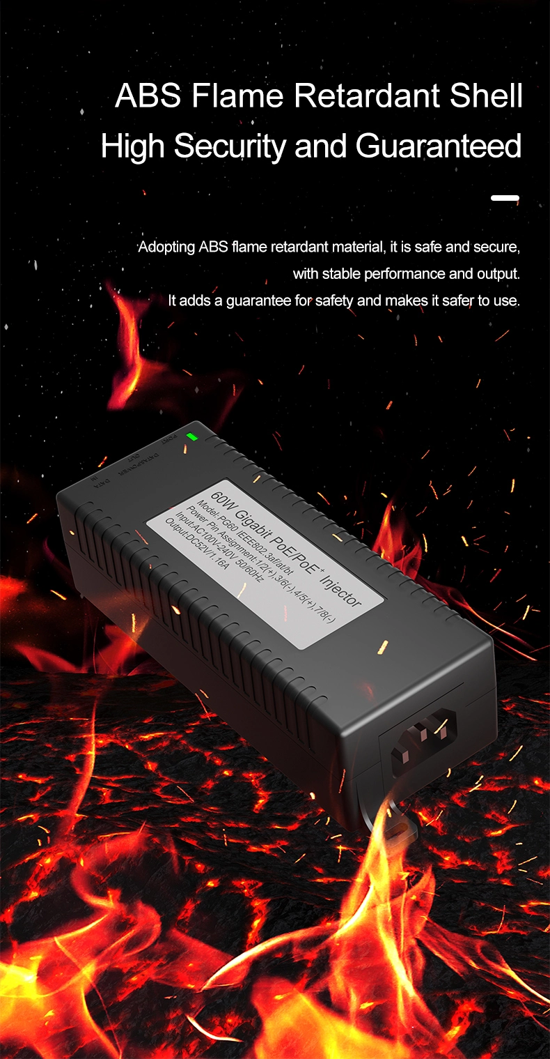 Sikkerhedsovervågning: Gigabit 60 W desktop POE-injektor til IP-kamerasikkerhed og netværksenhed giver stabil strøm til IP-kameraer og PTZ-kameraer.