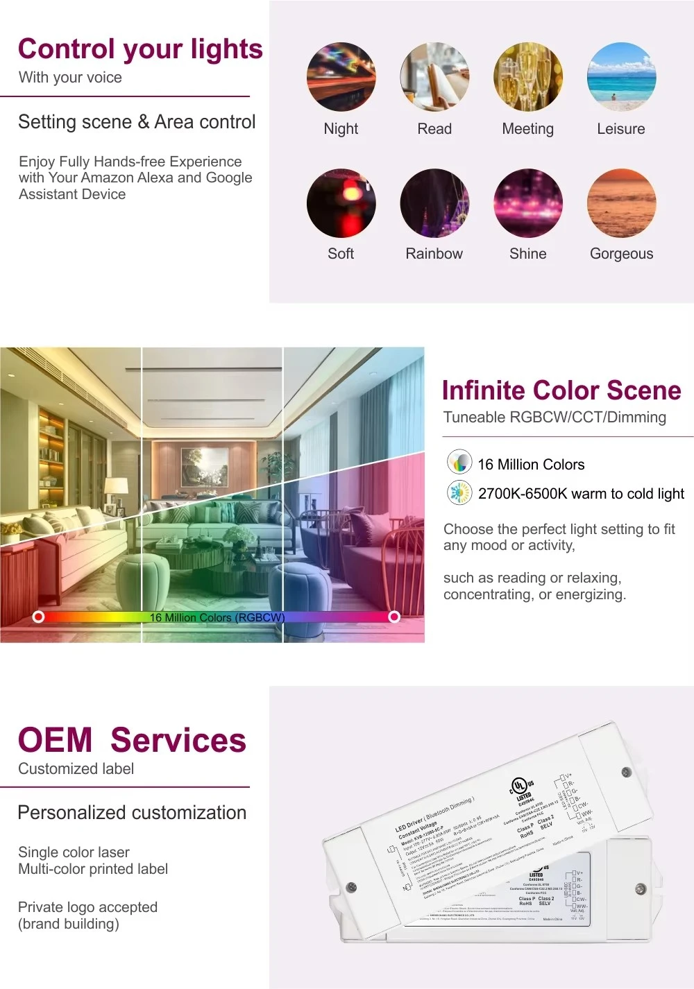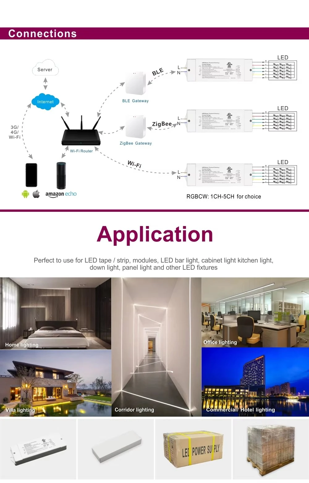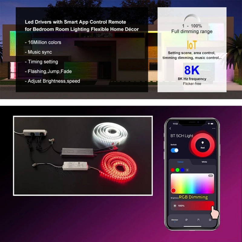 Smart dæmpning lige ved hånden Med et integreret ZigBee trådløst modul med TUYA-teknologi tilbyder denne driver problemfri smart kontrol. Juster lysstyrken via mobilapp eller stemmekommandoer gennem Google Home og Amazon Echo. Den højfrekvente 8K Hz PWM-udgang sikrer fuldstændig flimmerfri dæmpning, mens dæmpningsområdet på 1-100 % med 1 % dybde giver mulighed for jævne overgange og perfekt stemningsskabelse.