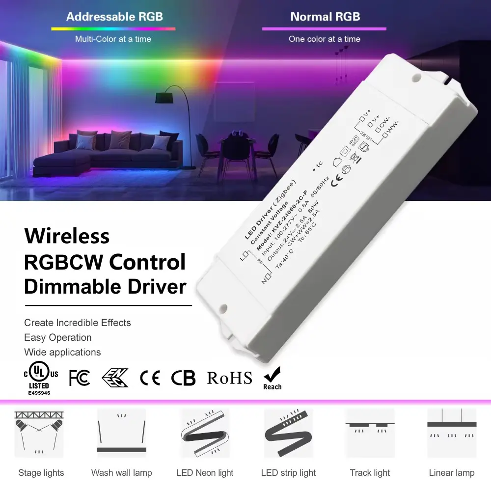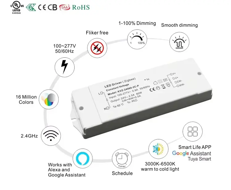 Nem installation, varig ydeevne Zigbee 3.0 led Driver 60W er designet til enkelhed og har ligetil ledningsforbindelser, der er både enkle og sikre. Med en IP20-klassificering er den velegnet til tørre og fugtige steder - indendørs eller beskyttede miljøer. Bakket op af en 5-års garanti giver den langsigtet ro i sindet.