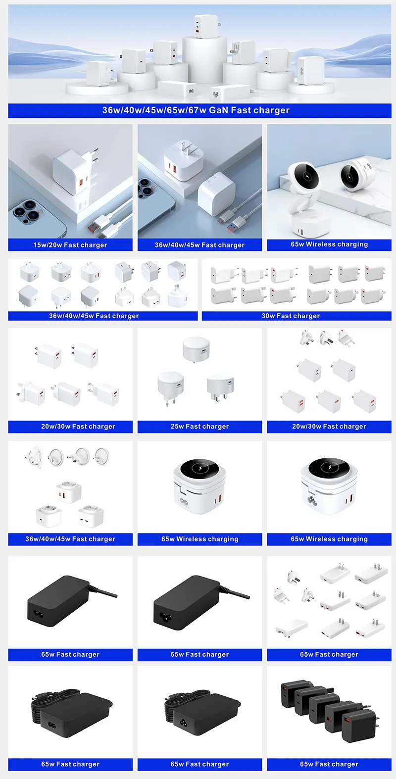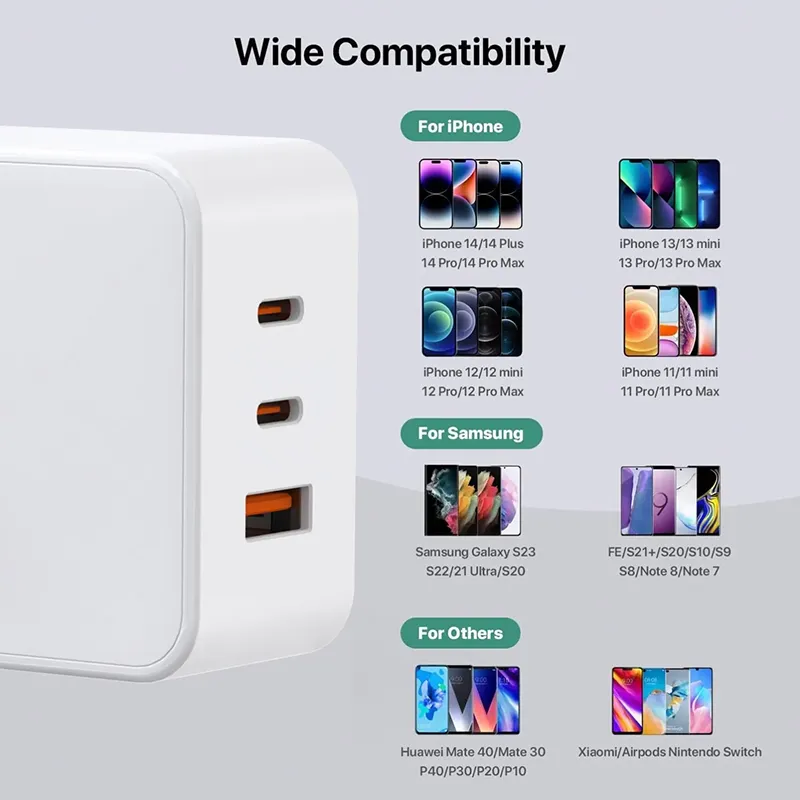 Denne oplader leverer op til 65W konsistent strøm og oplader effektivt bærbare computere (f.eks. MacBook Air/Pro, Dell XPS), tablets, smartphones (iPhone, Samsung Galaxy) og andre enheder, der understøtter PD-protokollen. Dens kompakte og lette design gør den ideel til rejser, mens indbygget overspændings-, overstrøms- og kortslutningsbeskyttelse sikrer sikker opladning af opladeren og tilsluttede enheder. Den er normalt udstyret med 1-2 USB-C-grænseflader, som understøtter opladning af flere små enheder på samme tid, hvilket balancerer strøm og bekvemmelighed.