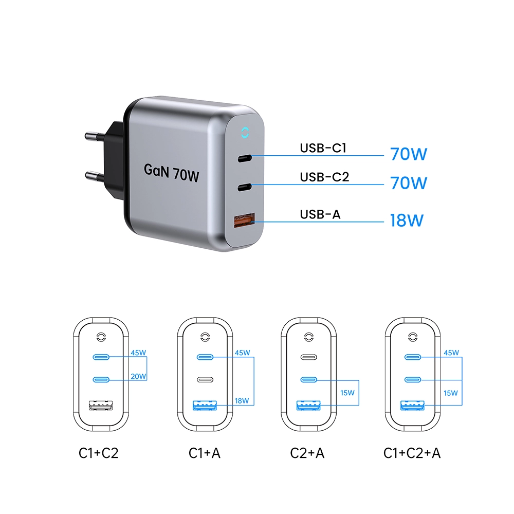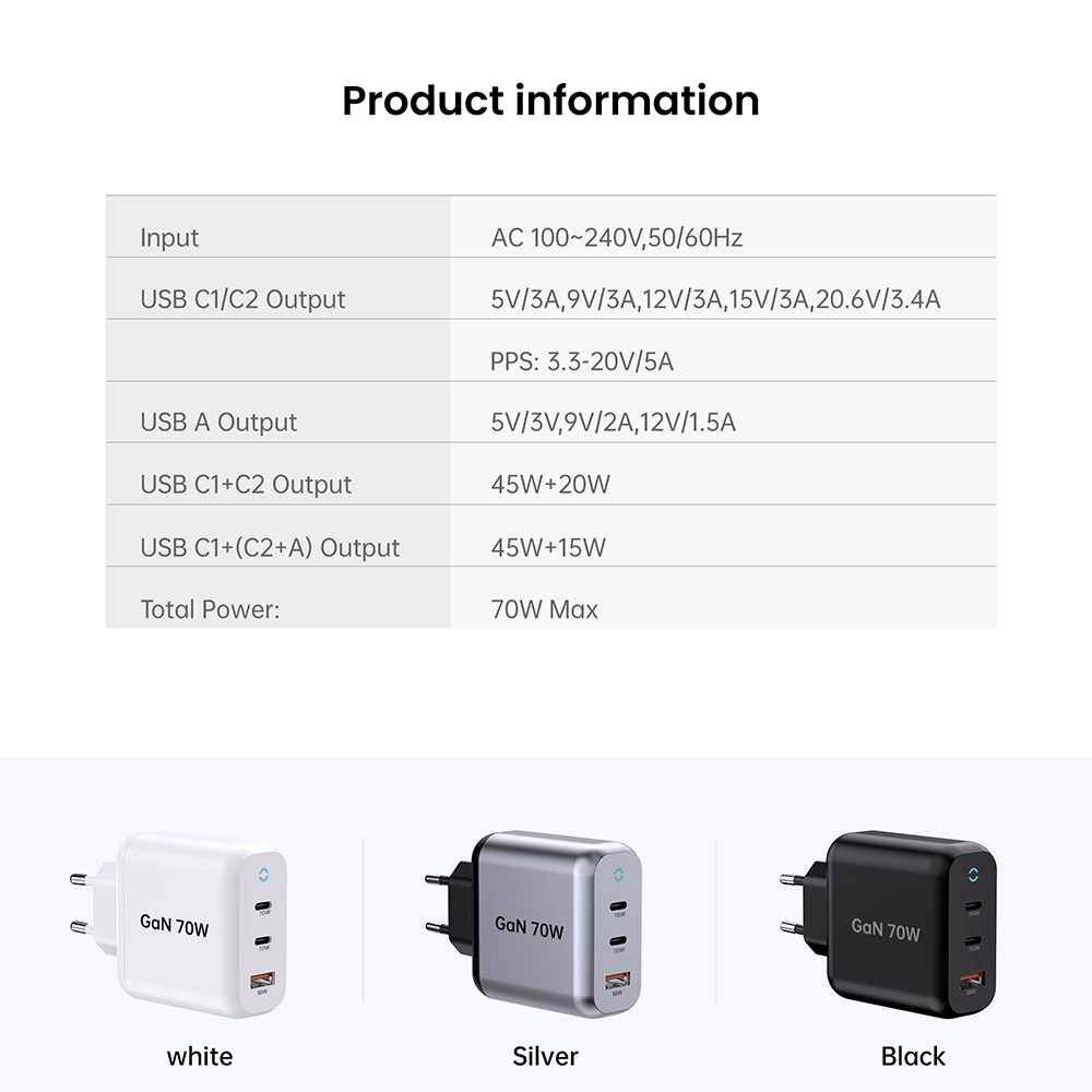 C1/C2 udgang: 5V3A,9V3A,12V3A,15V3A,20,6V3,4A (70W Max) PPS: 3,3-11V 4,05A USB-A-udgang: 5V3A,9V2A,12V1.5A 3,3-11V 2A (22W Max) C1+C2 Udgang: 45W+20W C1+C2+USB-A Udgang: 45W+5V3A I alt: 70W |