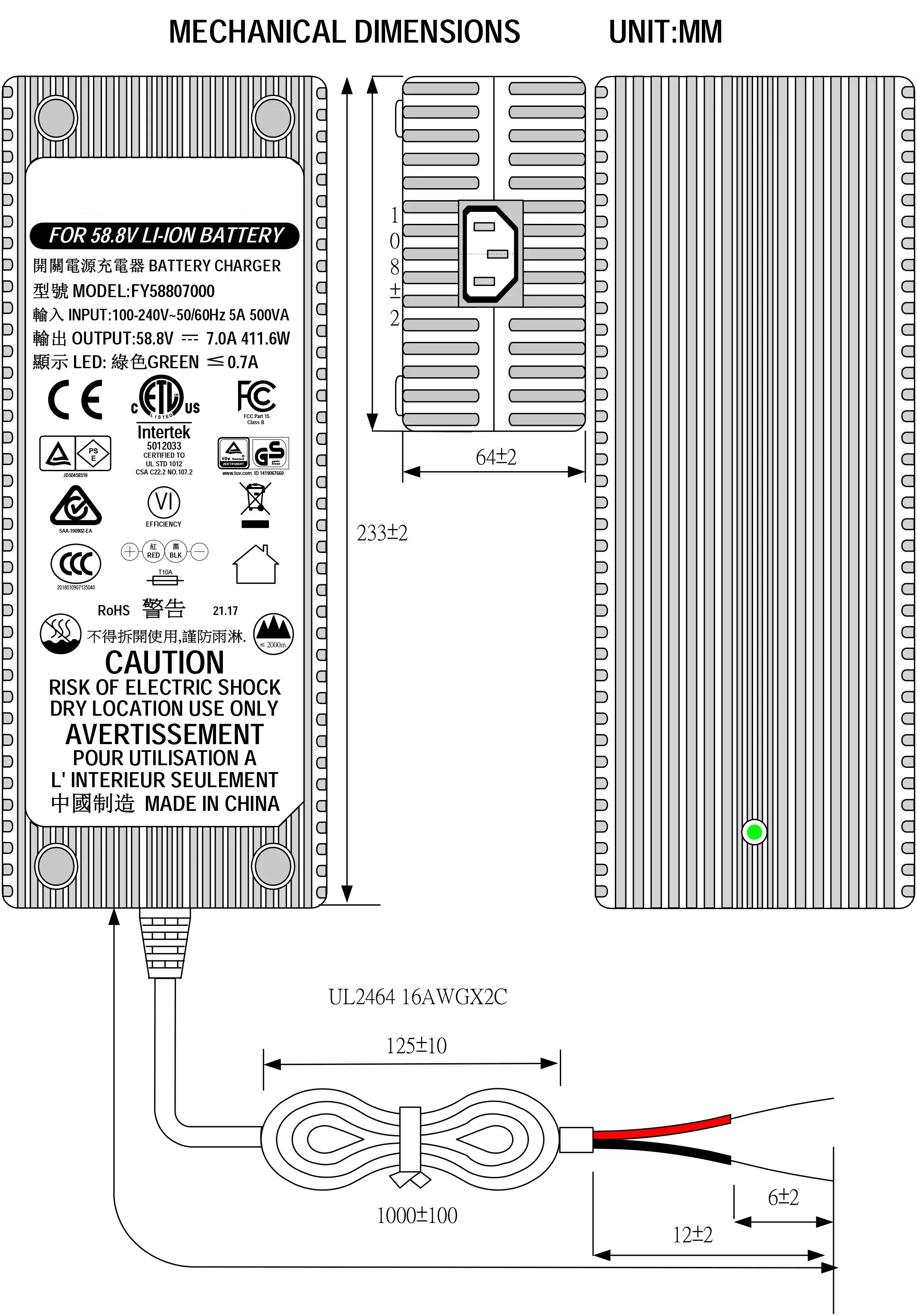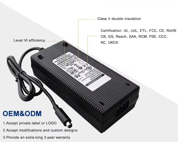 Certificeret til UL, ETL, CUL, GS, CE, BS, SAA, KC, PSE, CB, FCC, EMC, RoHS, REACH-standarder, leverer denne oplader effektiv, hurtig og sikker strøm til krævende elektriske mobilitetsapplikationer.