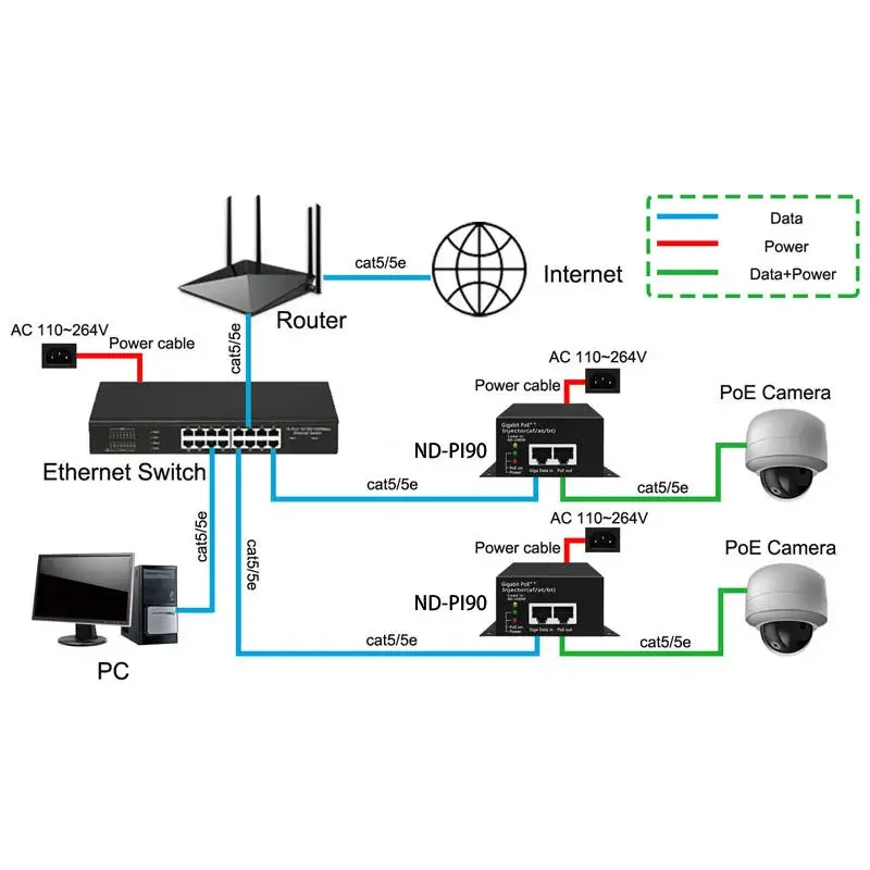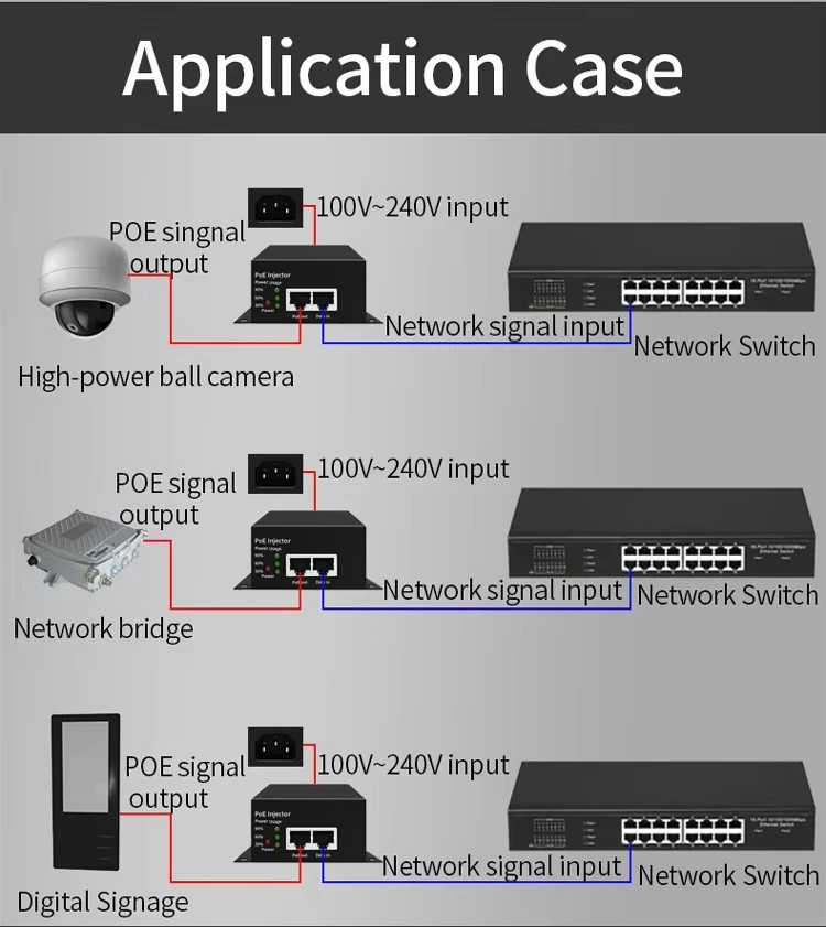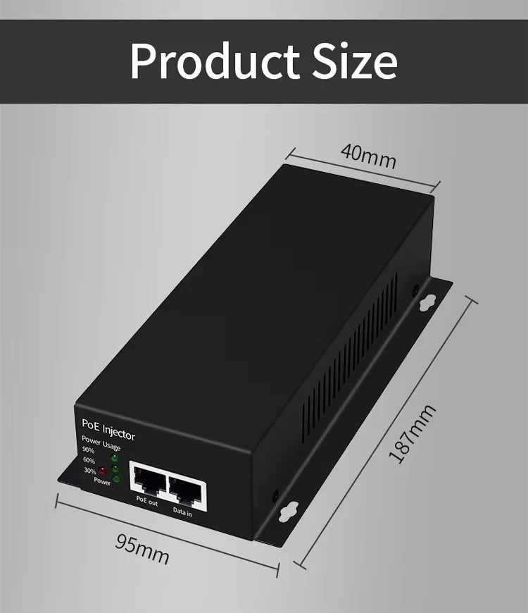 Konstrueret til alsidighed, denne injektor er bagudkompatibel med 802.3af/at-enheder. Den er ideel til at drive PTZ-kameraer, højtydende trådløse adgangspunkter og videokonferenceudstyr. Produktet giver en enkel plug-and-play-løsning, der eliminerer behovet for yderligere stikkontakter og reducerer installationens kompleksitet i virksomheder og industrielle applikationer.