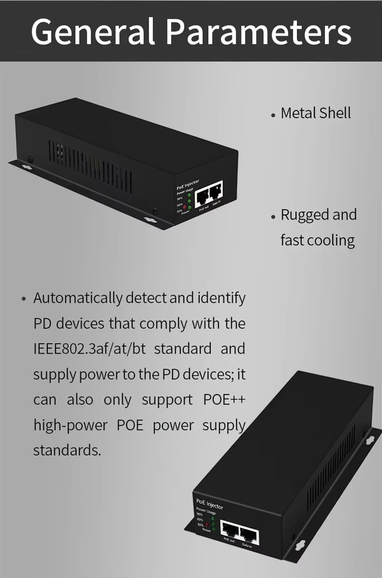 * Kompatibel med IEEE802.3bt standard protokol klassificering Klasse 8. * Reducer efterspørgslen efter omfangsrige strømadaptere og kabler, og sænk ledningsomkostningerne. * Bredt AC-spændingsindgangsområde på 100-240V. * Understøtter netværksbåndbredde på 10/100/1000 Mbps.