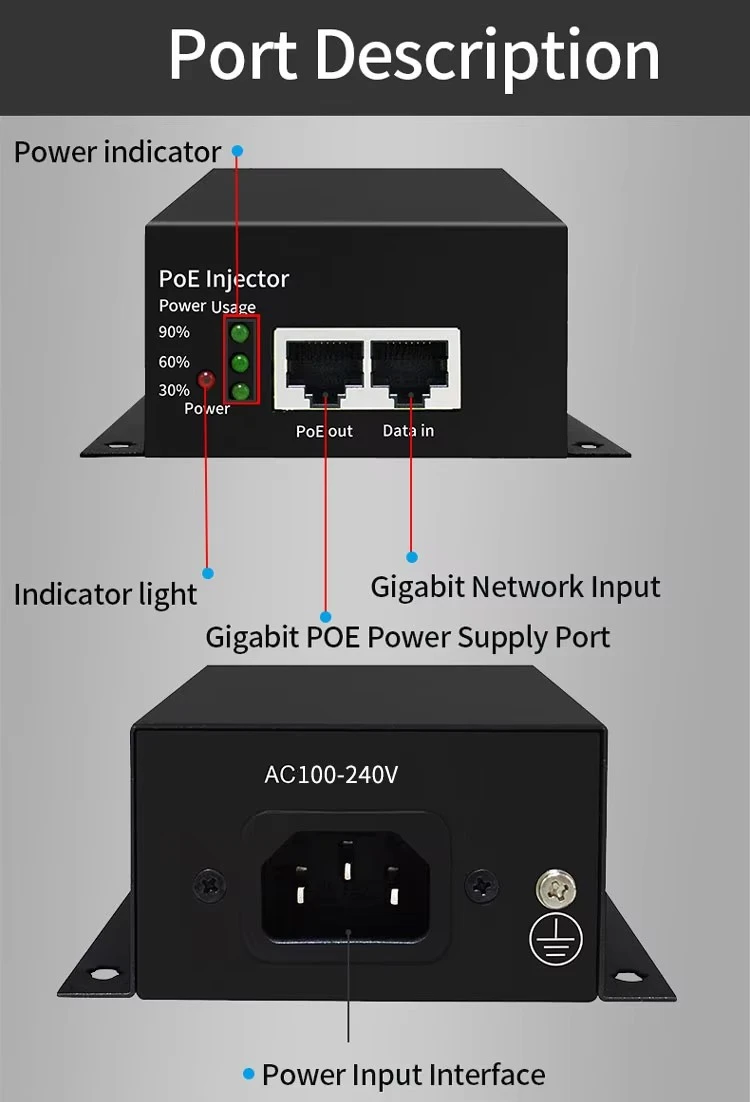 Pålidelig kraftydelse Med et indgangsspændingsområde på AC100-240V og en stabil DC48V1.25A udgang leverer den batteridrevne POE-injektor ren og konsistent 48V PoE-strøm til tilsluttede enheder. Den understøtter strømledningskernekonfigurationen på 1/2,4/5(+) og 3/6,7/8(-), hvilket sikrer bred kompatibilitet med forskellige PoE-drevne enheder i den modtagende ende.