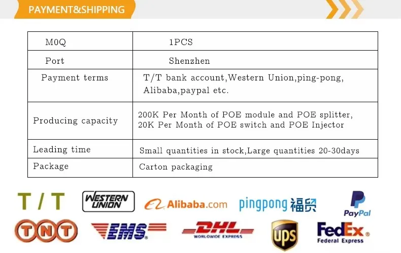 * POE Pin: 1,2+/3,6- 4,5+/7,8- * Automatisk registrering og beskyttelse af ikke-standard Ethernet-terminaler * Understøtter 10/100/1000Base-T LAN-miljø * Unik sammenlåsningsfunktion for nem installation