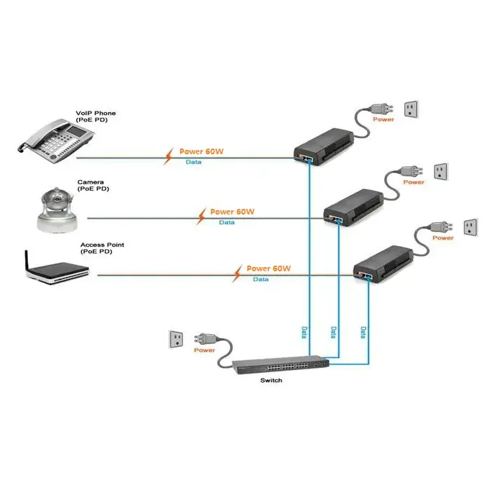 Leverer op til 60W output og understøtter fuldt ud IEEE 802.3bt/at/af-standarder. Den forsyner både laveffektenheder (15,4W) og højeffektudstyr (30W/60W), der dækker næsten alle Ethernet-drevne enheder og sikrer stærk PoE-kompatibilitet.