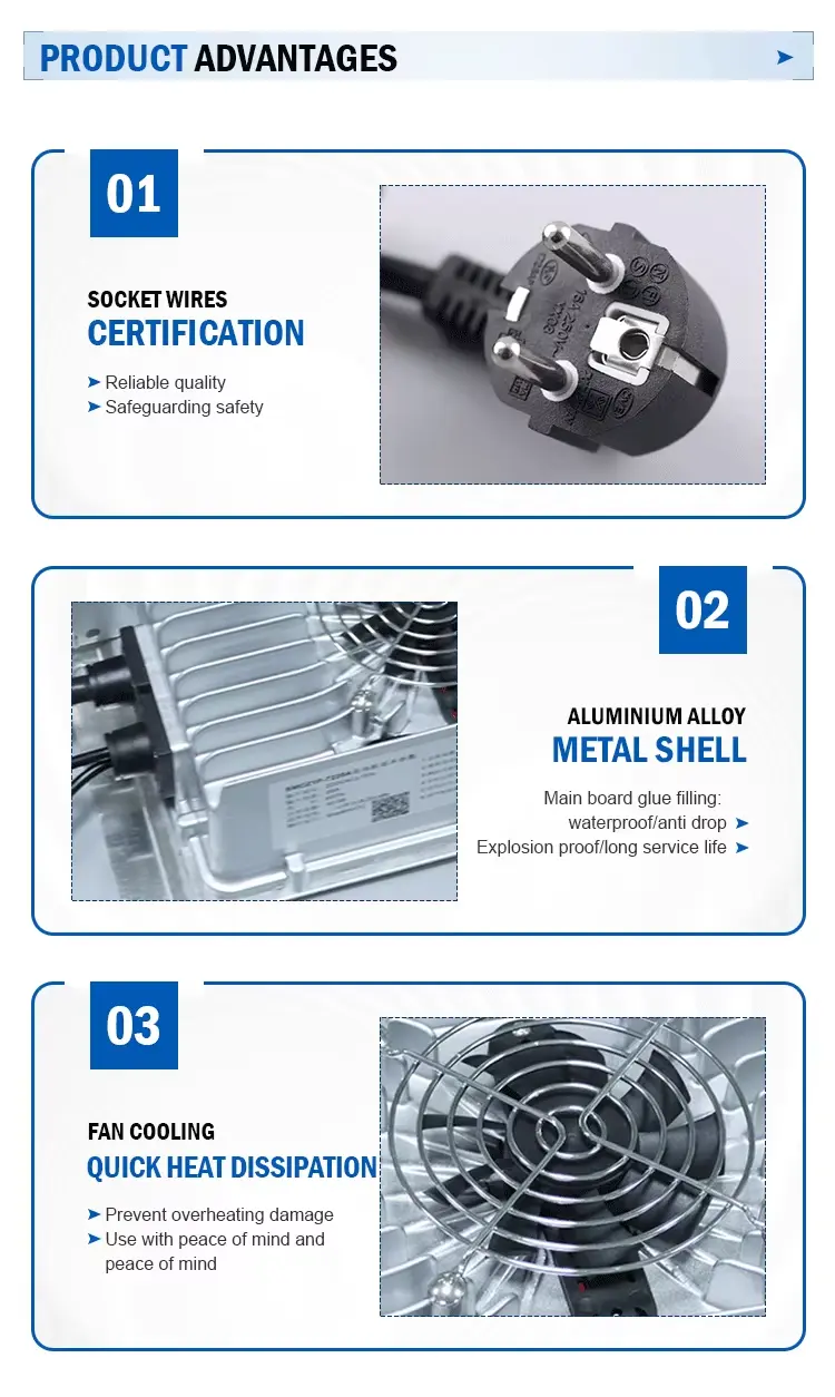 Høj effektivitet og smart beskyttelse: Med op til 93 % effektivitet og en effektfaktor på ≥0,98 minimerer denne oplader energitab og reducerer driftsomkostningerne. Indbyggede beskyttelser omfatter overspænding, kortslutning, omvendt polaritet og overtemperatursikring. En LED-indikator giver klar opladningsstatus med et øjeblik.