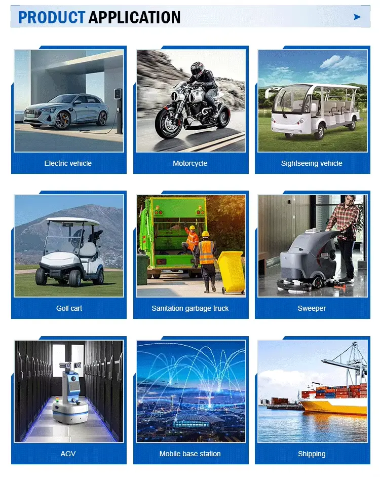 Anvendelse: Motorcykel/scooter, trehjulet cykel, Cropper, Fejemaskine, Gaffeltruck, Lastbil, El-bus, Blybatteri, El-køretøj, Sightseeing-køretøj, Logistikkøretøj, Rengøringskøretøj, Patruljevogn, Dune buggies, Skib, Kommunikationsudstyr