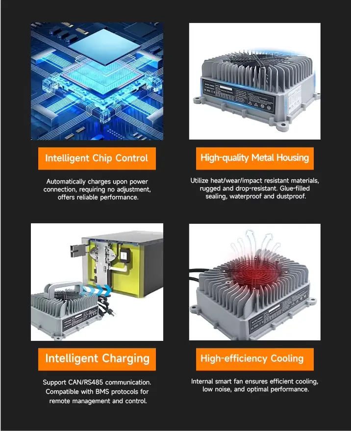 · Integreret OBC-kommunikationsprotokol muliggør intelligent opladningsstyring og beskytter batterier mod overopladning, overophedning og kortslutninger.