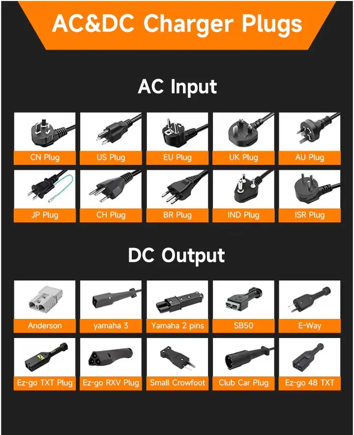 EU-stikket, normalt til EU-lande som Tyskland, Frankrig, Holland, Danmark, Østrig, Sverige osv. Det britiske stik, normalt til Storbritannien, Indien, Pakistan, Singapore og etc. AU-stikket, normalt til Australien, New Zealand, Argentina og etc. De almindelige DC-stik på markedet inkluderer Anderson, EZ-go, DS Club Car og Yamaha Connector osv.