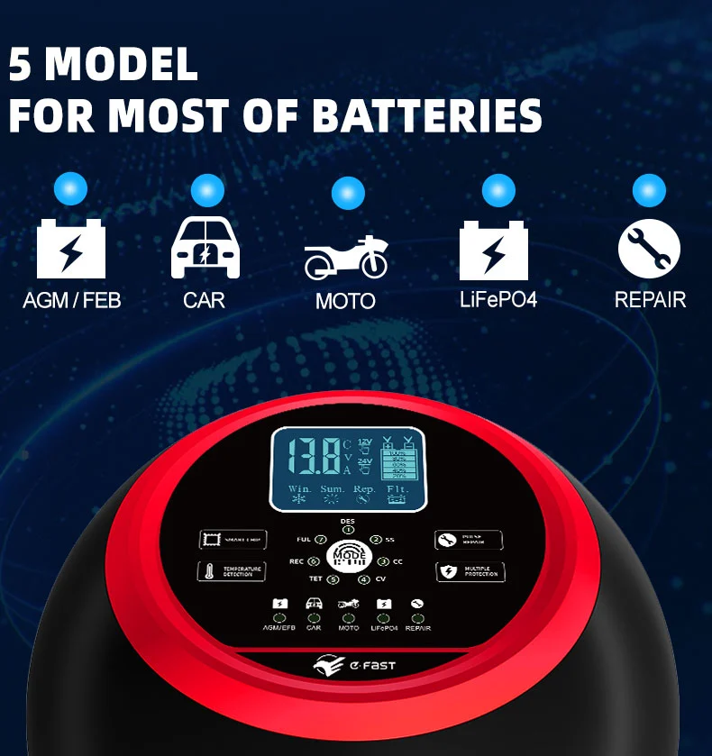 Denne oplader har et innovativt kompakt design og er udstyret med et high-definition LCD-display, der viser spænding, strøm, temperatur, opladningsforløb og batteristatus i realtid, hvilket gør betjeningen overskuelig med et øjeblik. Den har en indbygget pulsreparationsfunktion, der kan aktivere og reparere gamle batterier, hvilket forlænger deres levetid. Som en fuldautomatisk intelligent oplader understøtter TK-1500 "stik og glem"-drift: den registrerer automatisk batterispænding, vælger opladningstilstand og skifter til en vedligeholdelsestilstand for flydende opladning efter fuld opladning for at forhindre overopladning. Den er ideel til batterivedligeholdelse af køretøjer, der er parkeret i længere perioder eller sæsonbestemt udstyr såsom plæneklippere og både.
