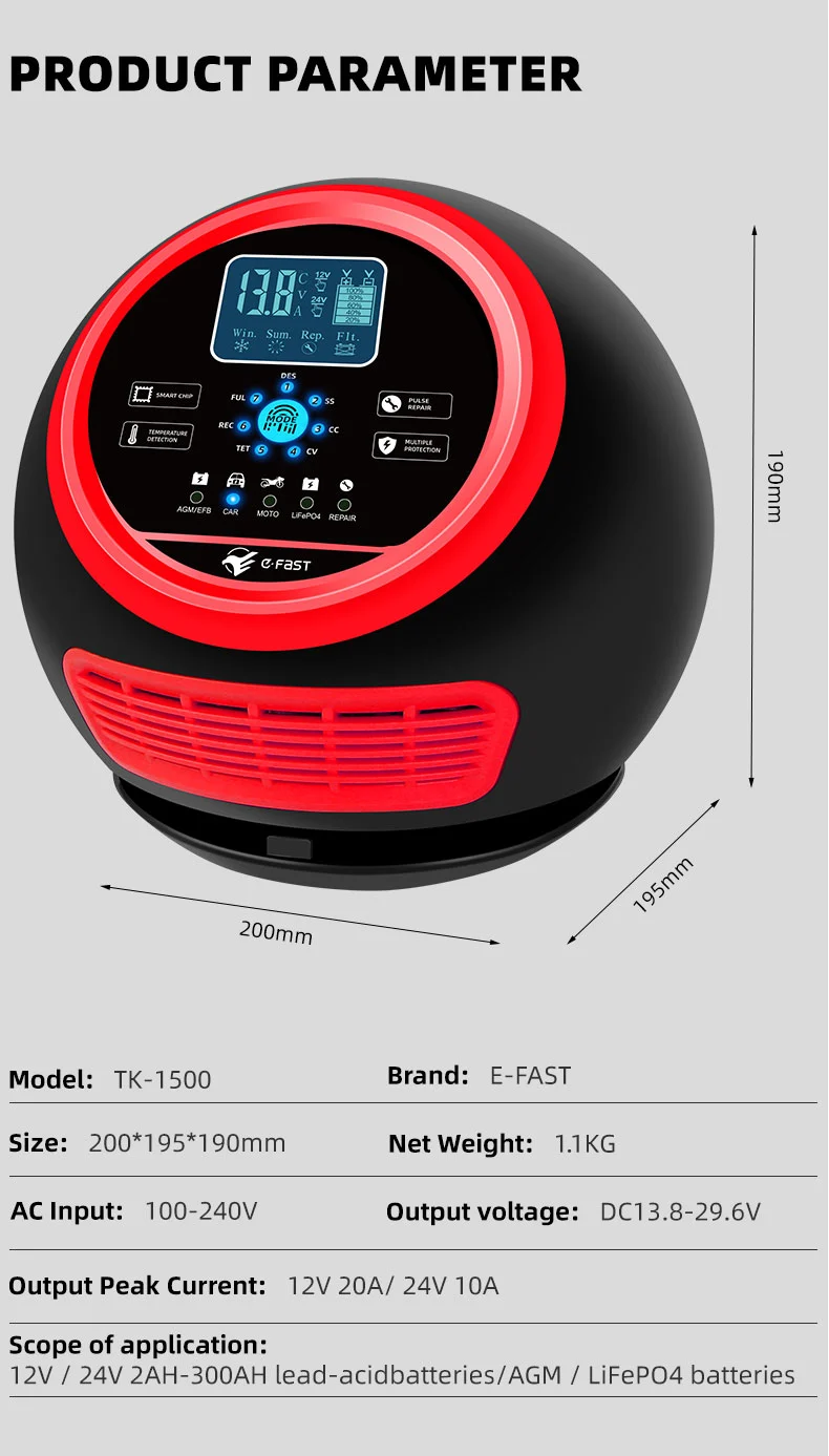TK-1500 er en kraftfuld fuldautomatisk batterioplader, der tilbyder to opladningstilstande: 12V/20A og 24V/10A. Den er specielt designet til biler, lastbiler, motorcykler, både, plæneklippere, SUV'er, autocampere, traktorer og alle slags scootere. Uanset om det er traditionelle blybatterier (oversvømmede, AGM, gel, deep cycle, calciumbatterier) eller avancerede lithiumjernphosphat (LiFePO4) og lithium-ion batterier, kan TK-1500 intelligent identificere og matche den bedste opladningskurve og virkelig opnå multifunktionalitet i én enhed.