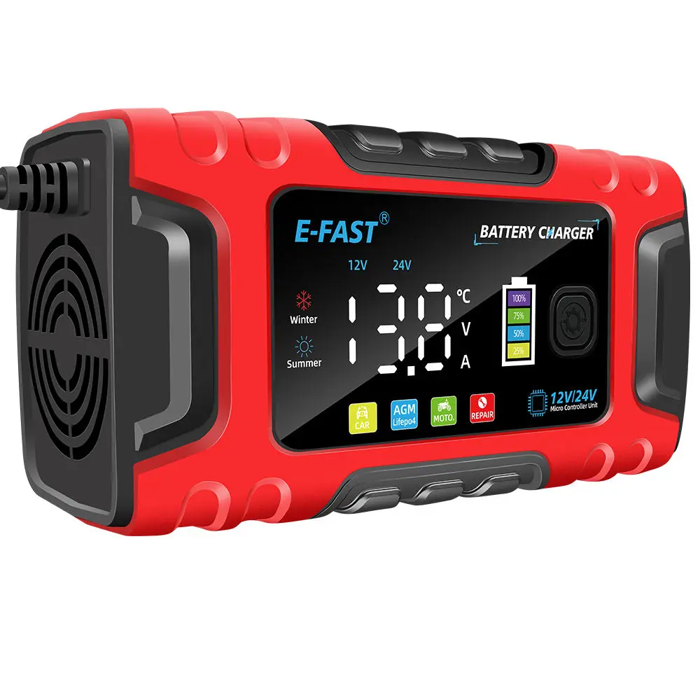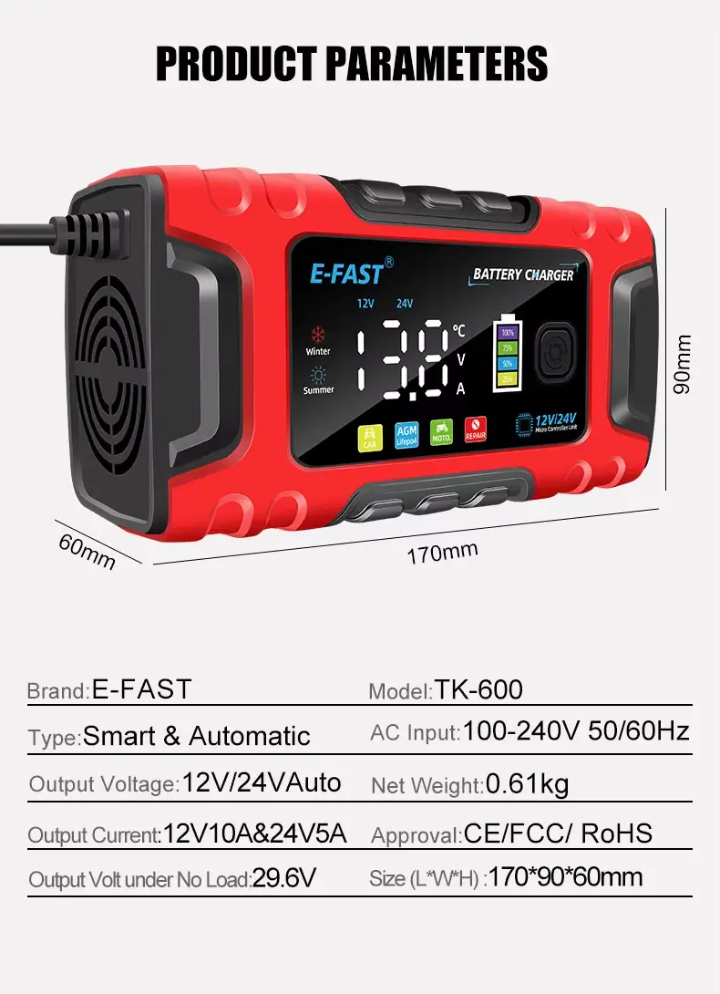 Højkvalitets E-Fast TK-600 fuldautomatisk med Pulse Repair Technology 12V10A 24V5A blysyre lifepo4 batterioplader til bil |