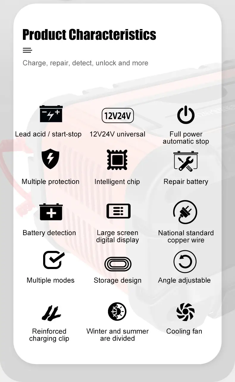 TK700 Universal 12V 24V blysyrebatterioplader fra Starwell, en professionel producent og leverandør i Kina, er et højtydende intelligent opladningssystem designet til en bred vifte af blysyrebatterier. Bygget til bil-, marine-, industri- og nødstrømsapplikationer kombinerer den automatisk spændingsdetektion, avanceret reparationsteknologi og stabil outputkontrol for at sikre pålidelig energigenopretning og langsigtet batterivedligeholdelse. TK700 Universal 12V 24V blysyrebatterioplader er udviklet til at levere både hurtig opladning og dyb vedligeholdelse i én kompakt enhed.