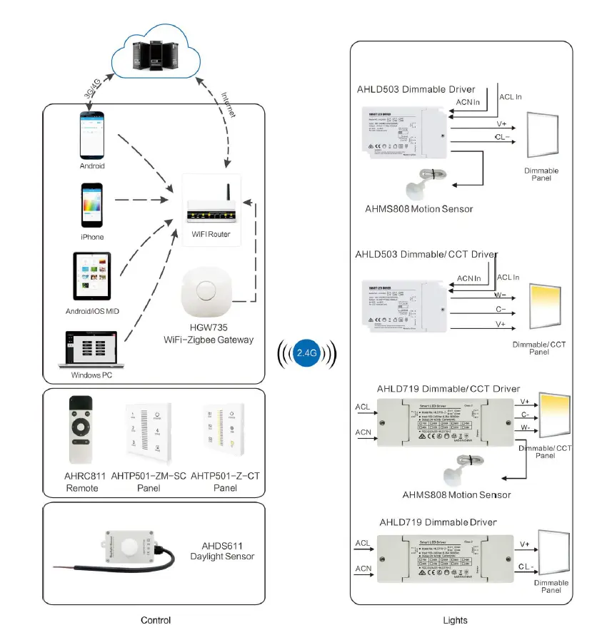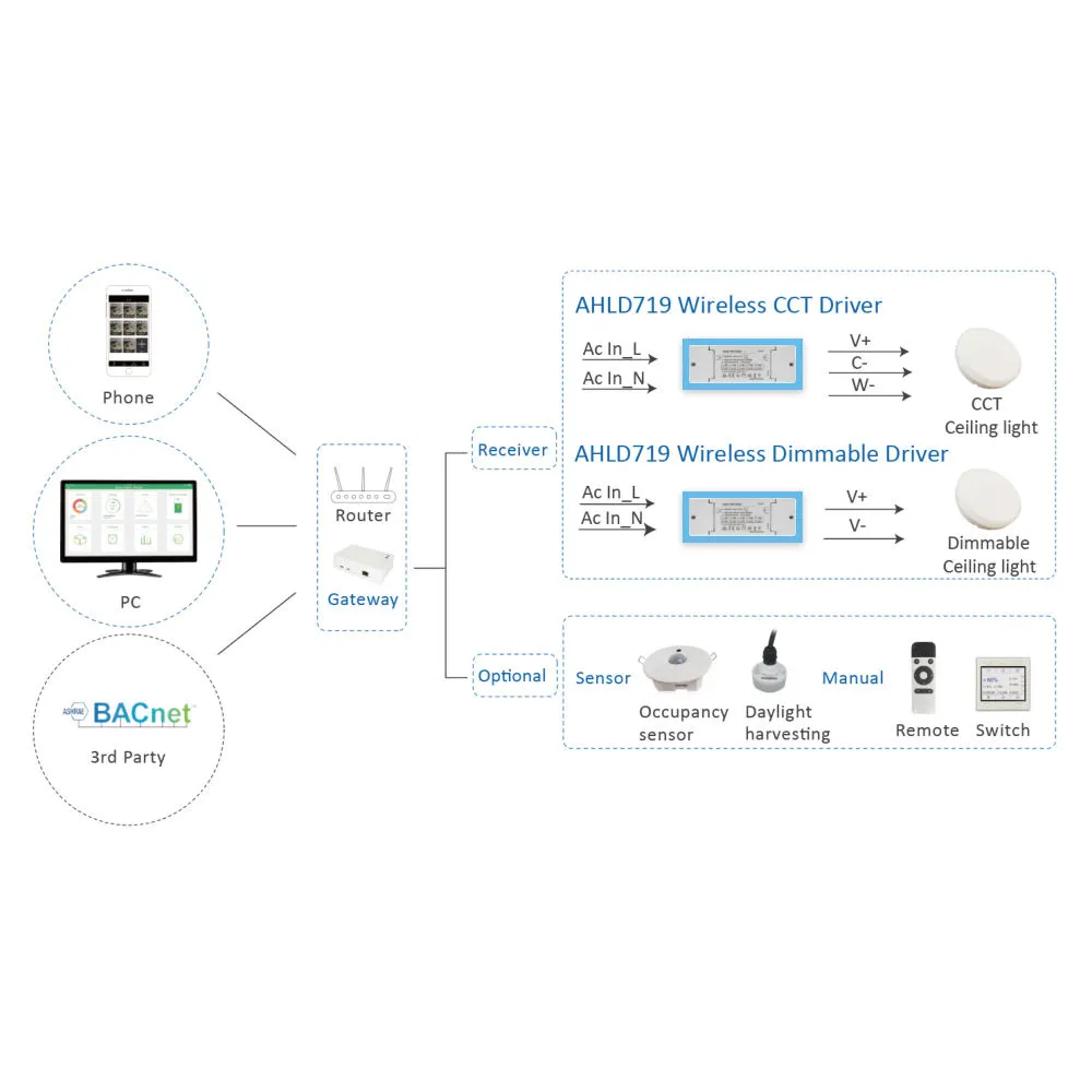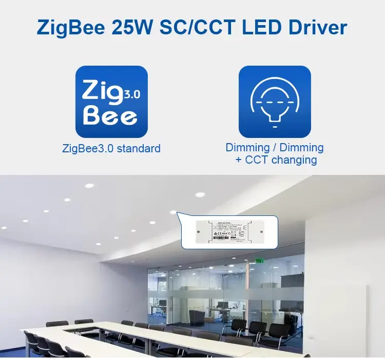 Driveren opererer inden for et Zigbee-netværk og forbinder til en Zigbee-gateway for at aktivere smarte lysfunktioner såsom planlægning, scenekontrol, gruppekontrol og automatisering. Denne type LED-driver bruges almindeligvis i smarte hjemmebelysningssystemer, kommercielle belysningsinstallationer og intelligente bygningskontrolmiljøer.
